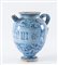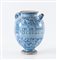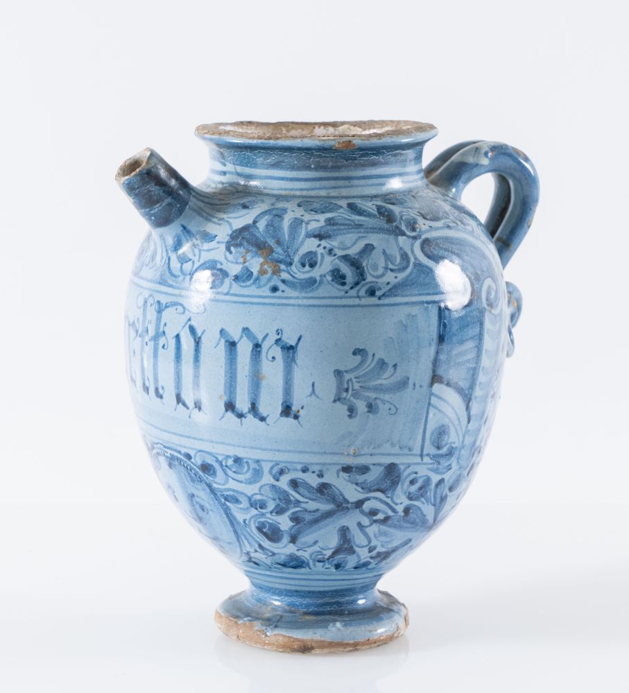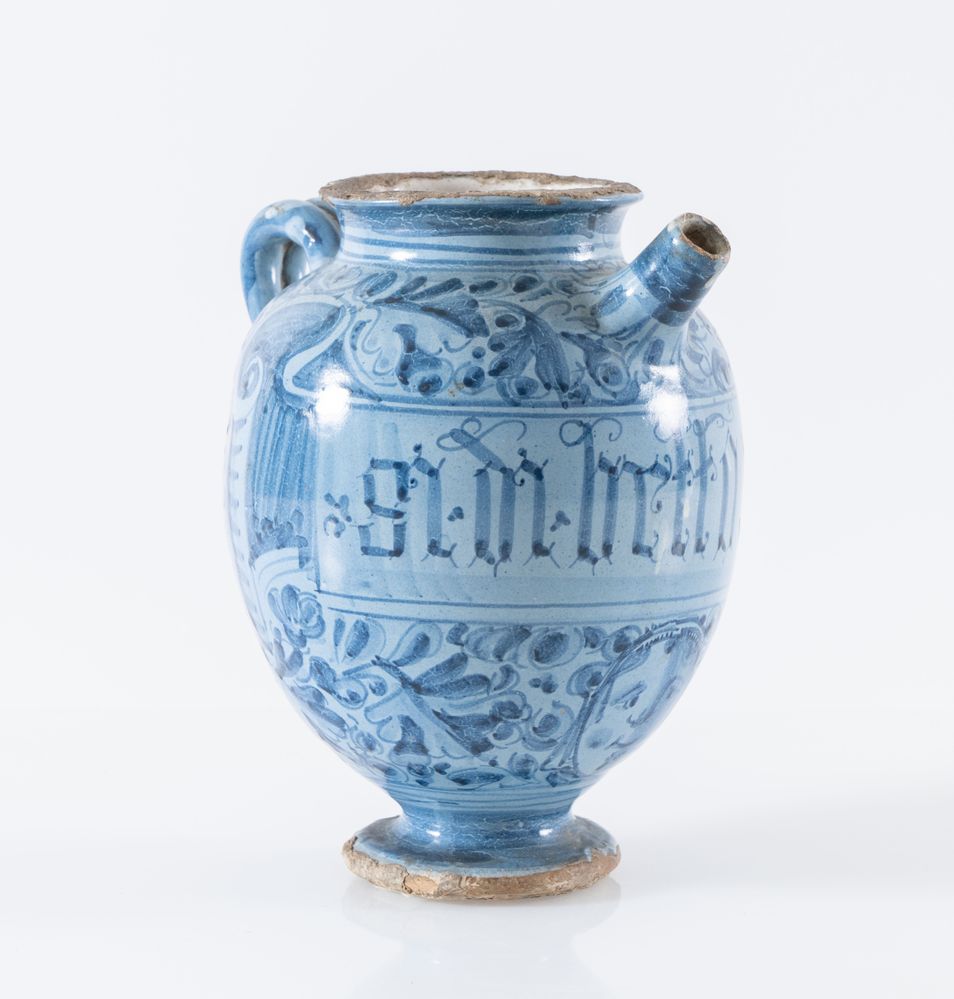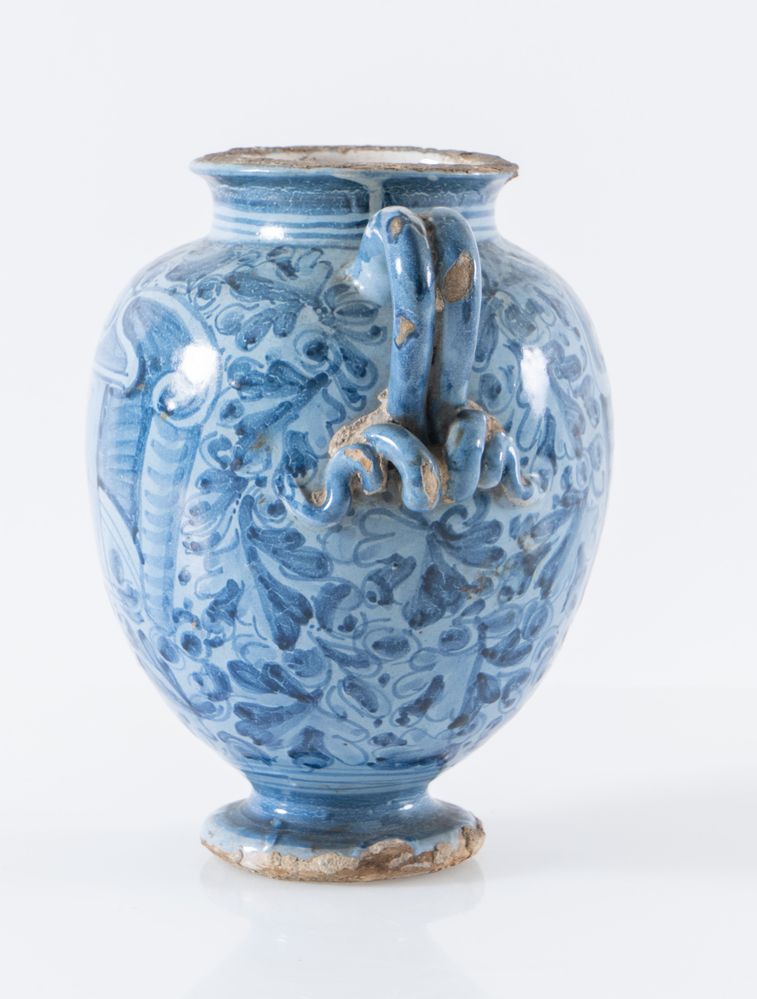 Vaso in maiolica monocroma blu a gran fuoco con iscrizioni farmaceutiche e insegna della farmacia. Prima metà del XVII secolo. Cadauno di h cm 22,8. Probabile Bottega faentina. (buono stato di conservazione, lieve sbeccature alla base)