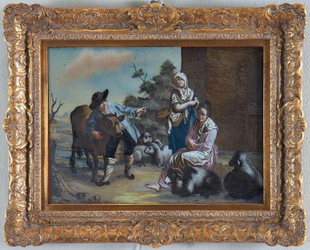 Ambito di Francesco Londonio, XVIII secolo. “Scena campestre”. Olio su vetro....