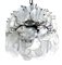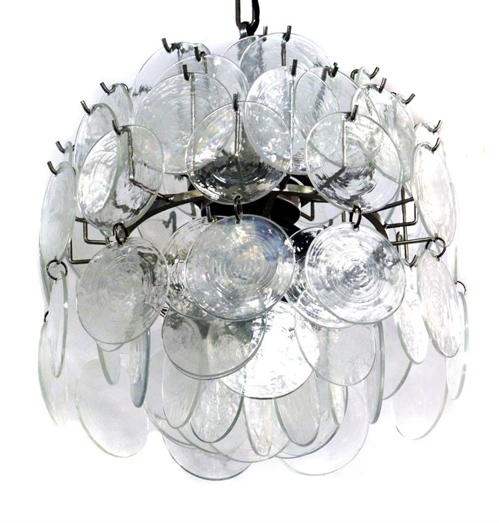 Lampadario a cinque ordini di dischi in vetro di Murano trasparente lievemente iridescente.