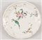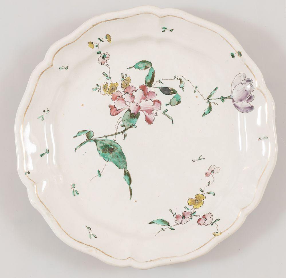BOTTEGA MILANESE Piatto in maiolica policroma a piccolo fuoco con bordo profilato in oro. Seconda metà del XVIII secolo. Diametro cm 22,5. (buono stato di conservazione: lievi usure all'oro e difetti di cottura)