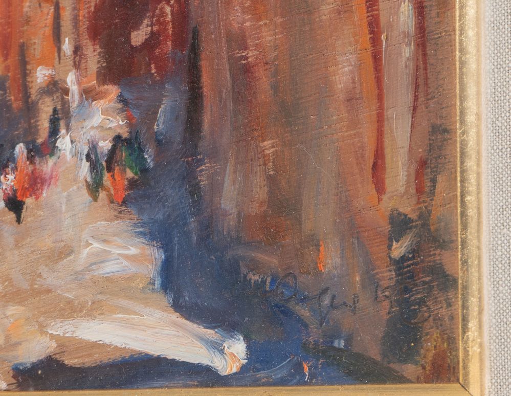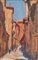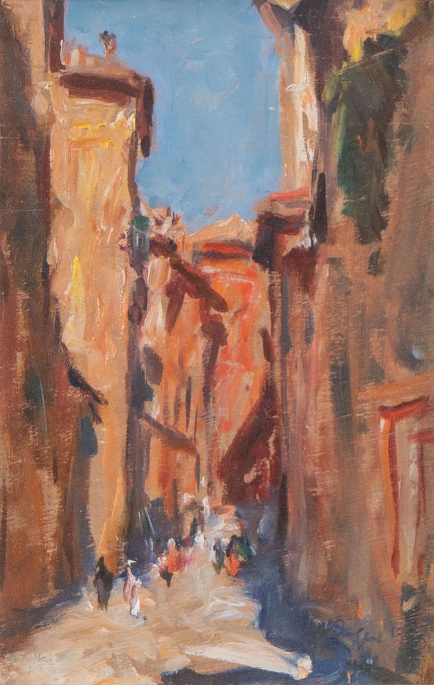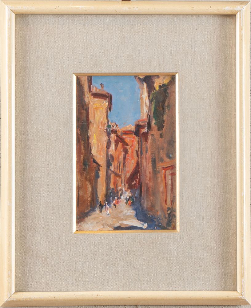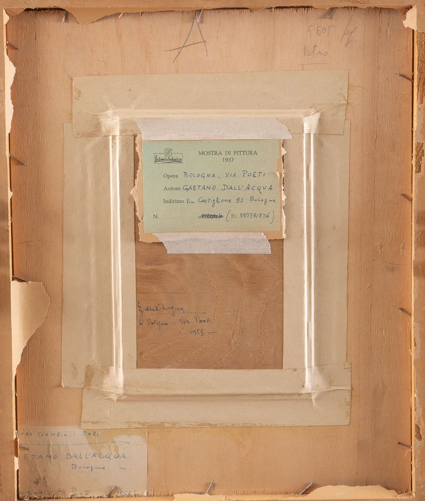 GAETANO DALL'ACQUA (Bologna 1897 - ) "Bologna, Via Poeti", 1953. Olio su tavola. Cm 25x16,5. Opera firmata e datata in basso a destra Dall'Acqua 1953. Al retro opera firmata, datata e intitolata Dall'Acqua, 1953, Bologna, Via Poeti. Al retra reca etichetta della mostra di pittura 1957 De la femeia bulgueisa. Esposizione: Mostra di pittura De la femeia bulgueisa, 1957.