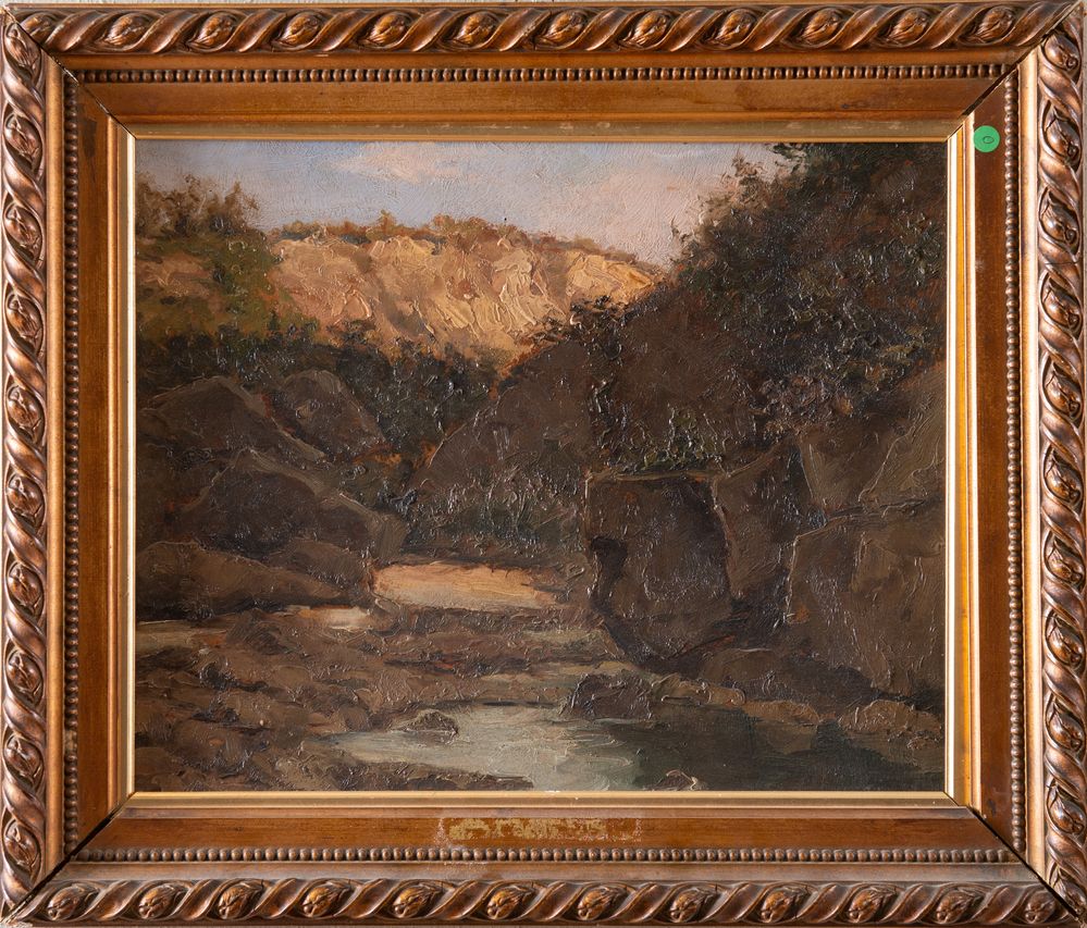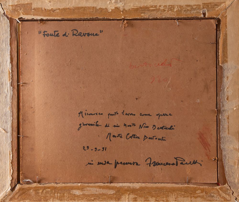 NINO BERTOCCHI (Bologna 1900 - 1956) "Fonte di Ravone". Olio su faesite. Cm 34,5x42. Al retro reca firma Bertocchi. Al retro reca autentica a firma della moglie.
