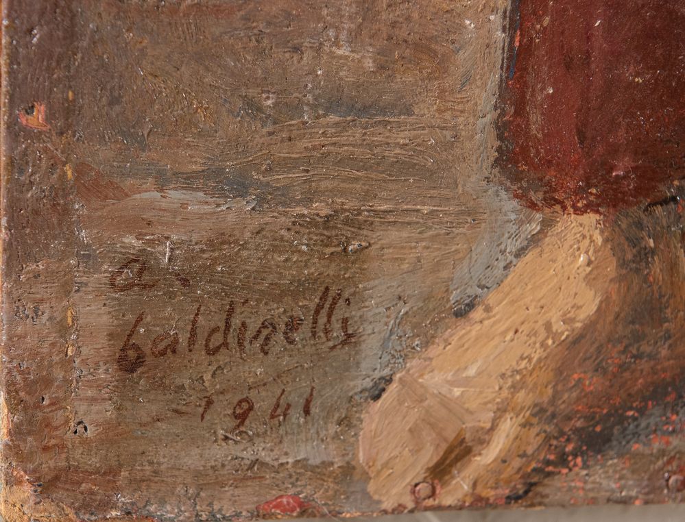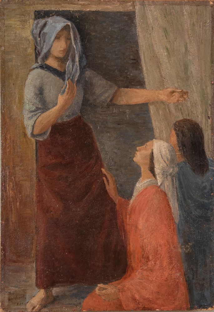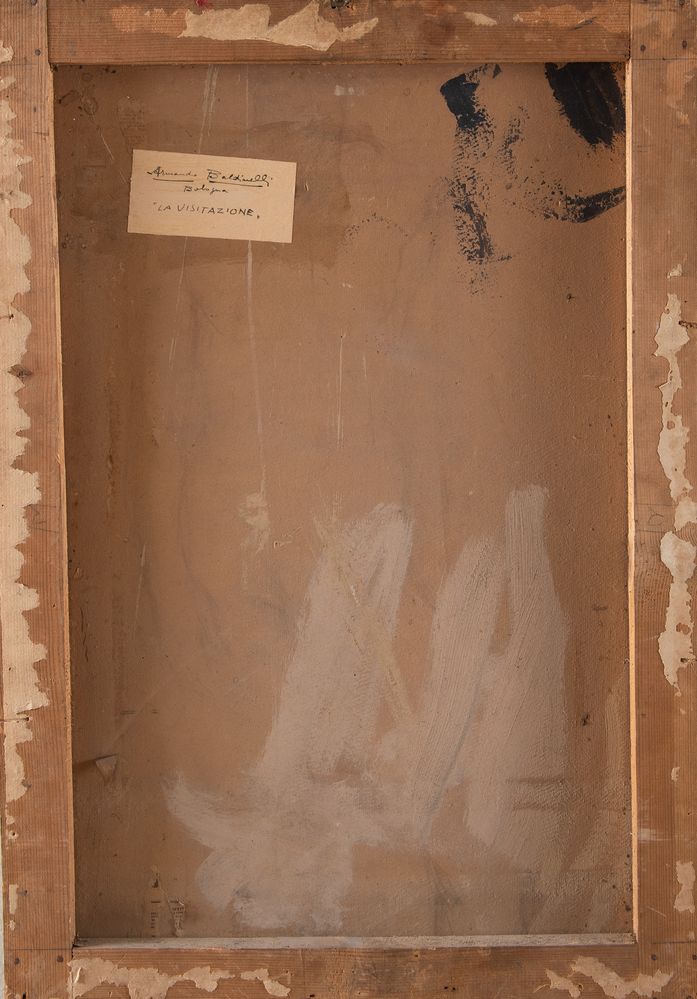 ARMANDO BALDINELLI (Ancona 1908 - Johannesburg 2002) "La visitazione", 1941. Olio su tavola. Cm 72,5x50,5. Opera firmata e datata in basso a sinistra A. Baldinelli, 1941. Al retro reca etichetta.