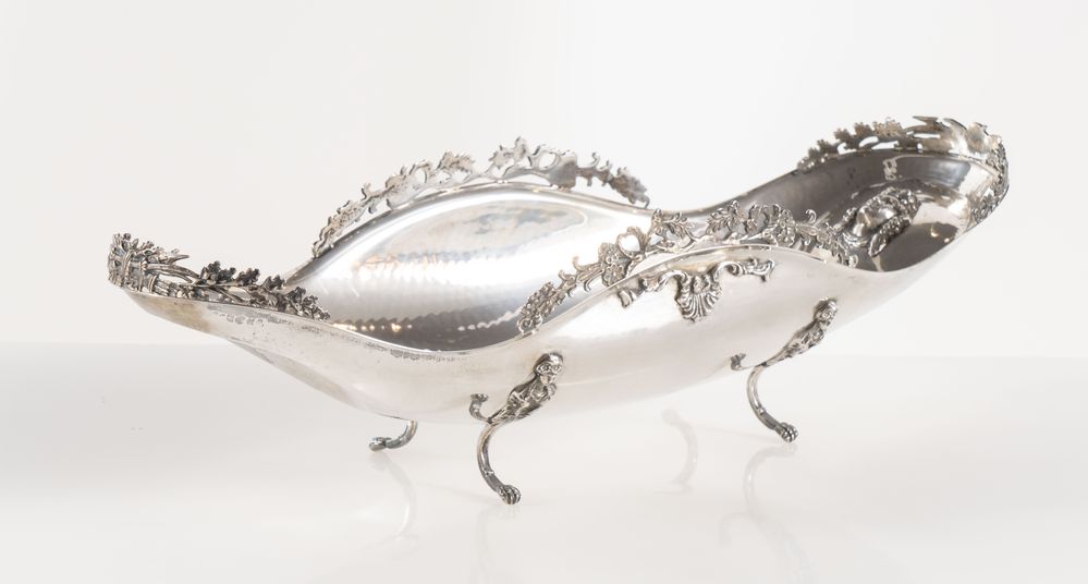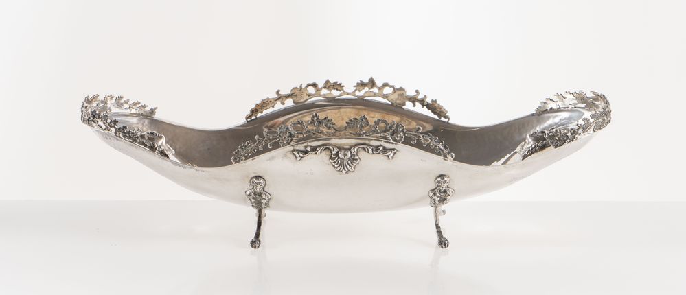 GREGGIO RINO, Padova, prima metà del XX secolo. Centrotavola in argento 800. Sul bordo superiore reca punzoni: 800, battuto a mano e losanga locativa 29PD. Cm 12,5x46x16. Peso: 904 gr.