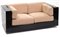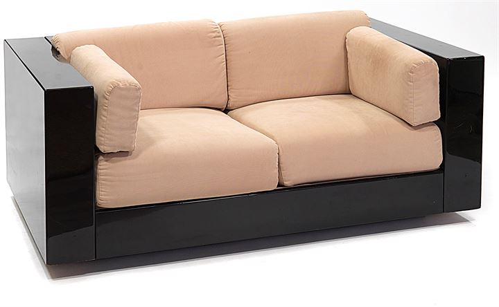 Divano in legno laccato al poliestere con rivestimento in tessuto.