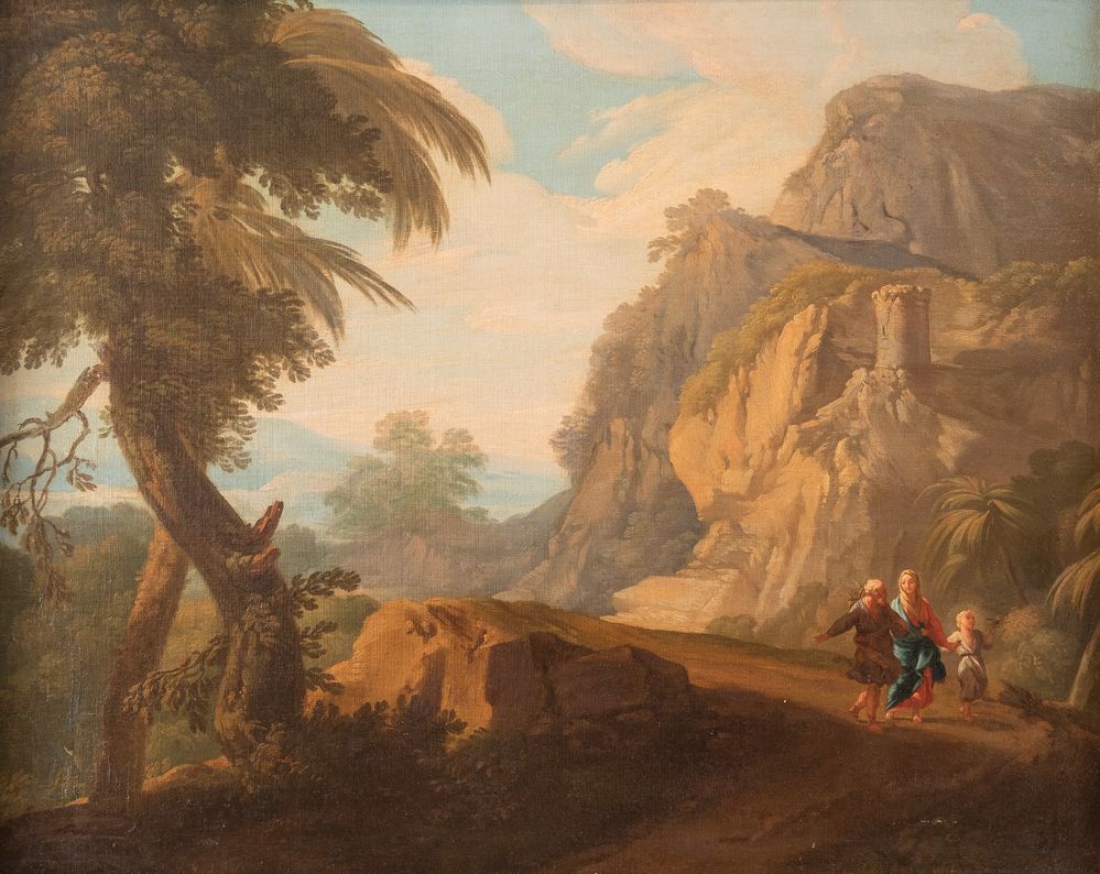 Maestro del XVIII secolo. "Paesaggio con Sacra Famiglia". Olio su tela. Cm...