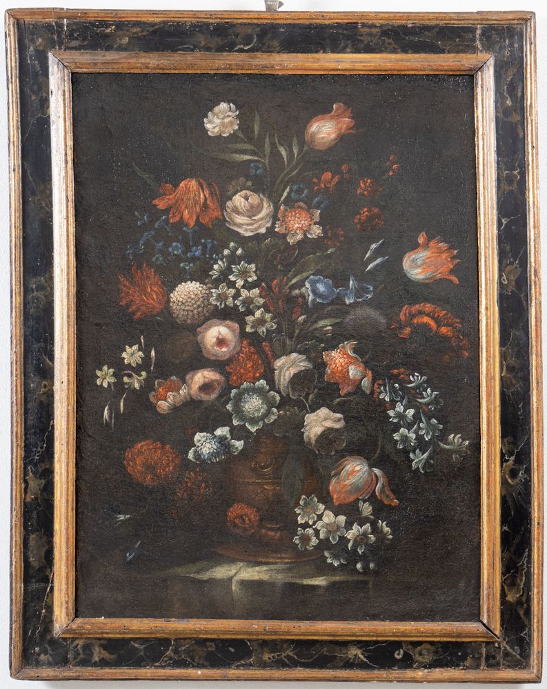 Maestro toscano del XVII secolo "Natura morta con fiori". Olio su tela. Cm 84x62. Cornice coeva. (restauri)