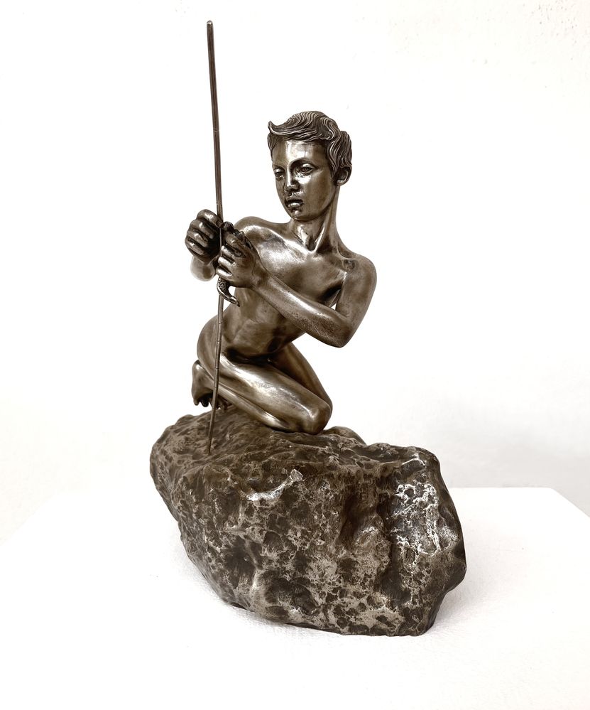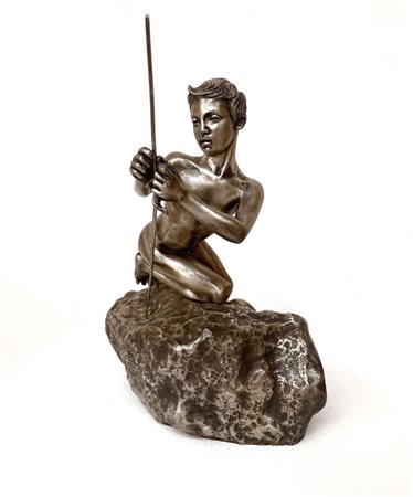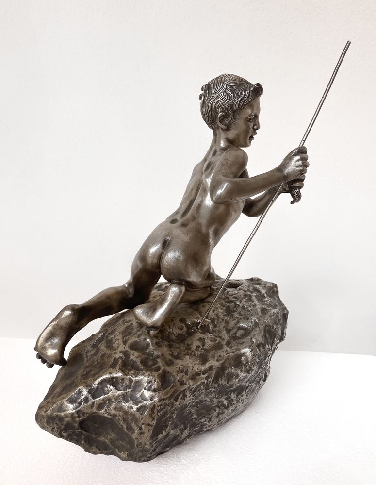VINCENZO GEMITO (Napoli 1852 - 1929) "Pescatorello sullo scoglio". Scultura in argento. Al retro reca punzone Fonderia Gemito Napoli e firma Gemito. Cm 25x22x16. Peso: 1938 gr.