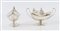 Argentiere IY, Londra, 1787. Coppia di salsiere in argento 925. Nel lato inferiore recano punzoni: leone passant, donna di profilo, lettera dataria m, corona, IY. Cadauna di cm 14x23,5x11,5. Peso: 1136 gr.