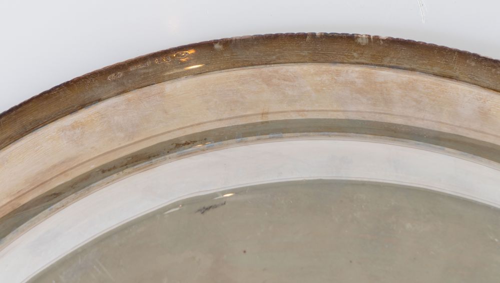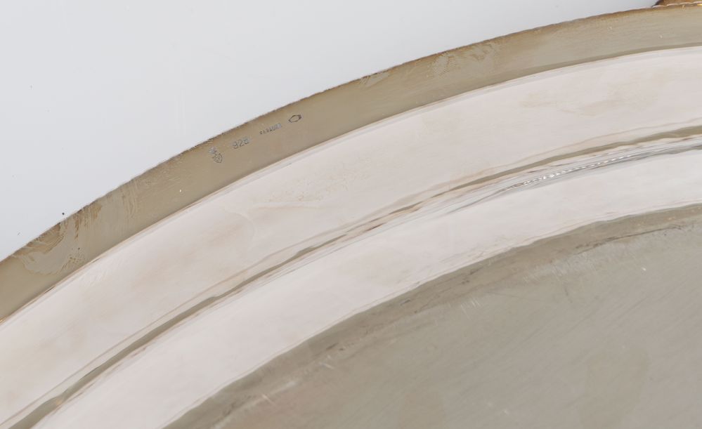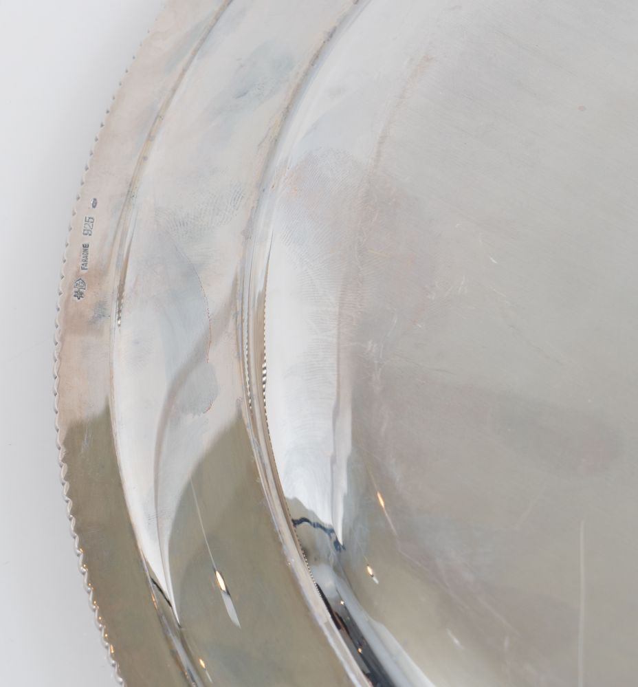 Quattro vassoi in argento 925. Sotto la base recano punzoni: 925, Faraone, stemma dell'argentiere e losanga locativa. Rispettivamente di cm: diametro 36; diametro 40; cm 39,5x27,7; cm 37,5x51,5. Peso complessivo: 5462 gr.