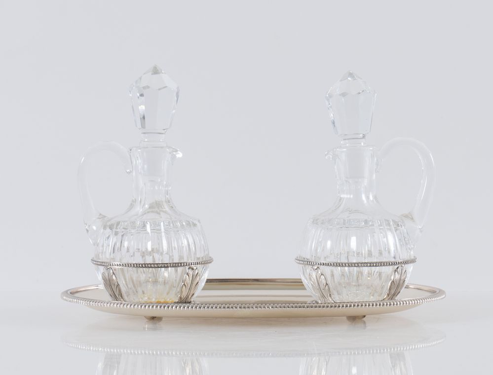Oliera in argento 925. Reca punzone: 925, Faraone, stemma dell'argentiere e losanga locativa. Cm 16x24x16,5. Peso dell'argento: 420 gr.