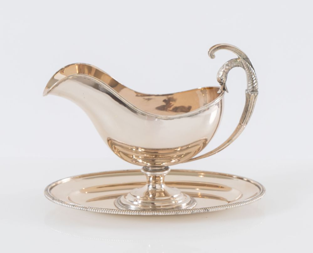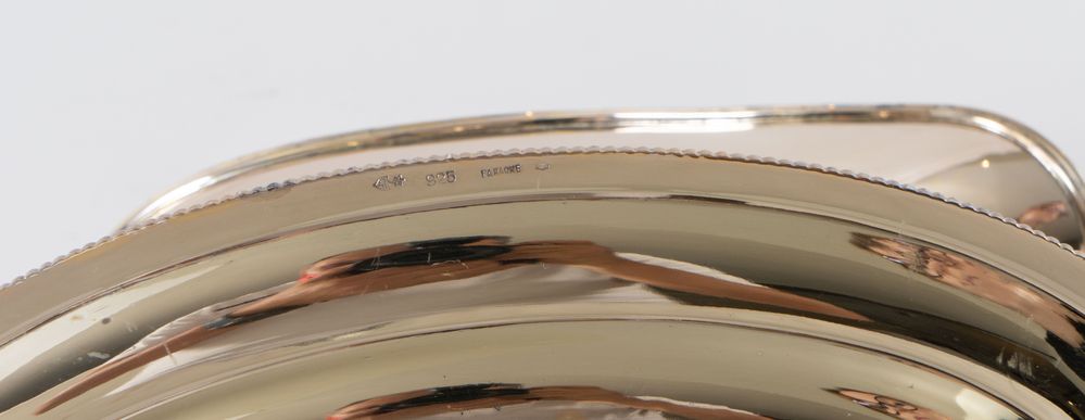 Salsiera in argento 925. Reca punzone: 925, Faraone, stemma dell'argentiere e losanga locativa. Cm 15x25x16. Peso: 910 gr.