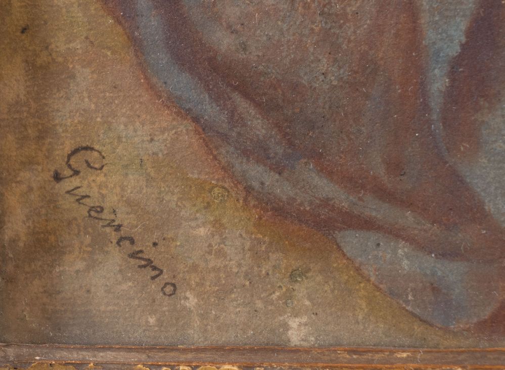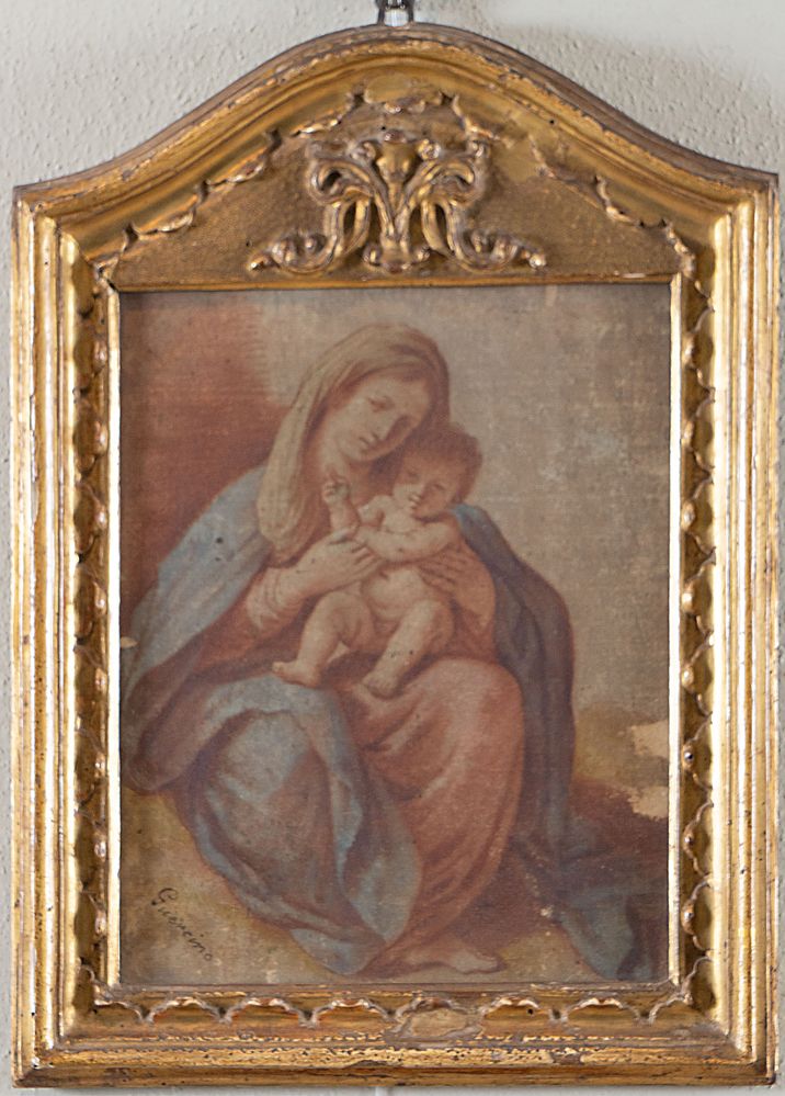 Maestro del XVIII secolo. “Madonna con Bambino”. Disegno a sanguigna e pastelli. Cm 56x41. Reca antica attribuzione in famiglia a Guercino. Provenienza: importante collezione privata, Bologna.
