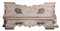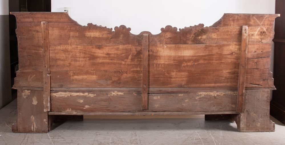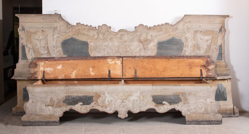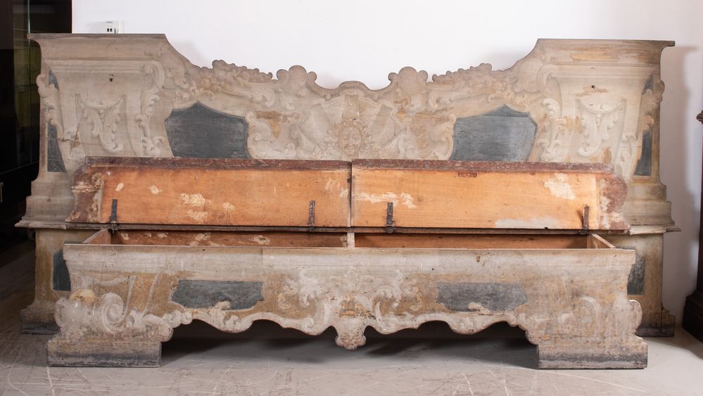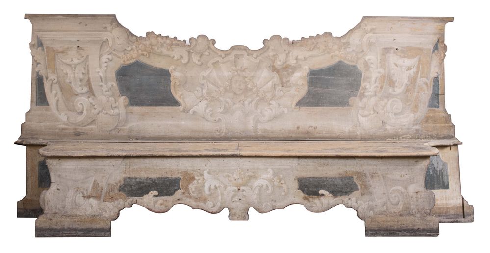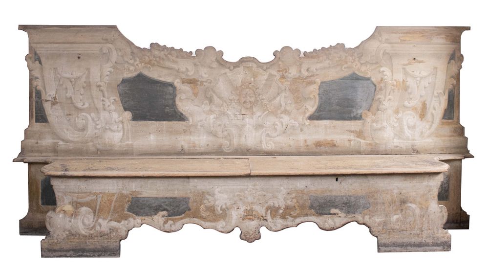 Coppia di monumentali panche barocche da androne, realizzate in massello di pioppo laccato e decorato. Bologna, seconda metà del XVII secolo. Cadauna di cm 147,5x324,5x41,5.