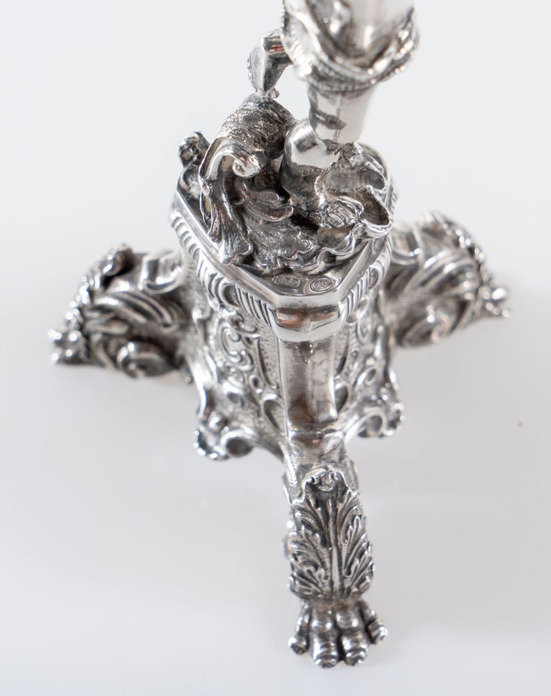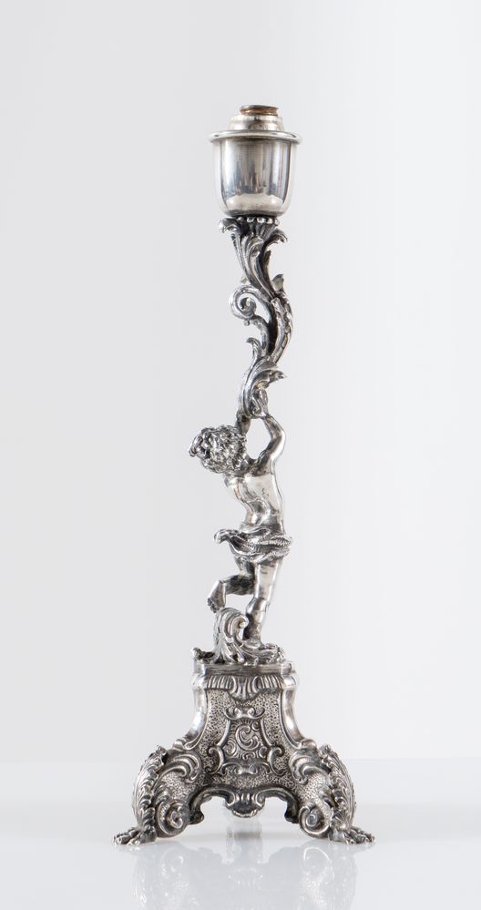 TADIELLO GAETANO, Milano, metà del XX secolo. Putto reggilampada in argento 800. Reca punzoni: 800 e MI515. Cm 27,5x10,5x9. Peso complessivo: 463 gr.