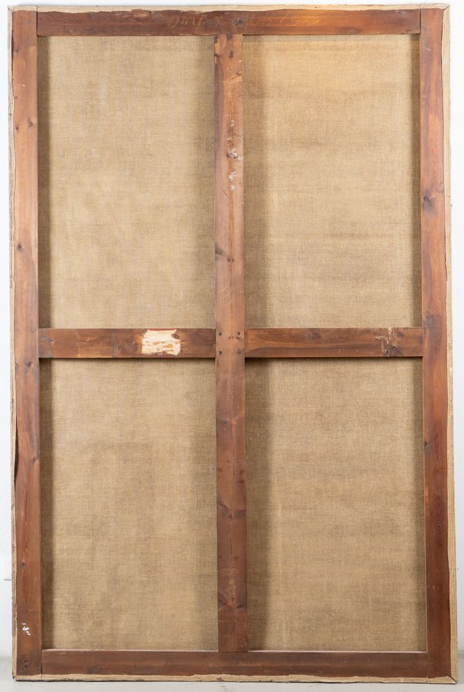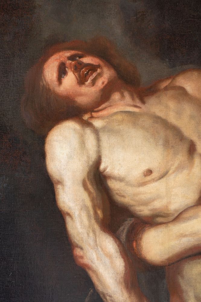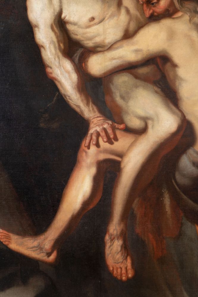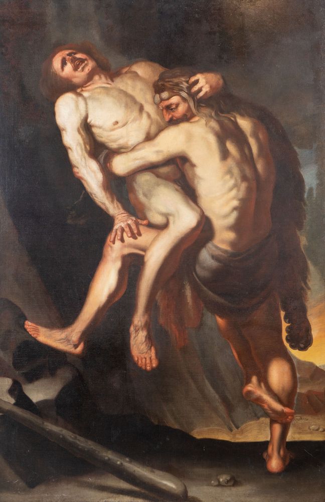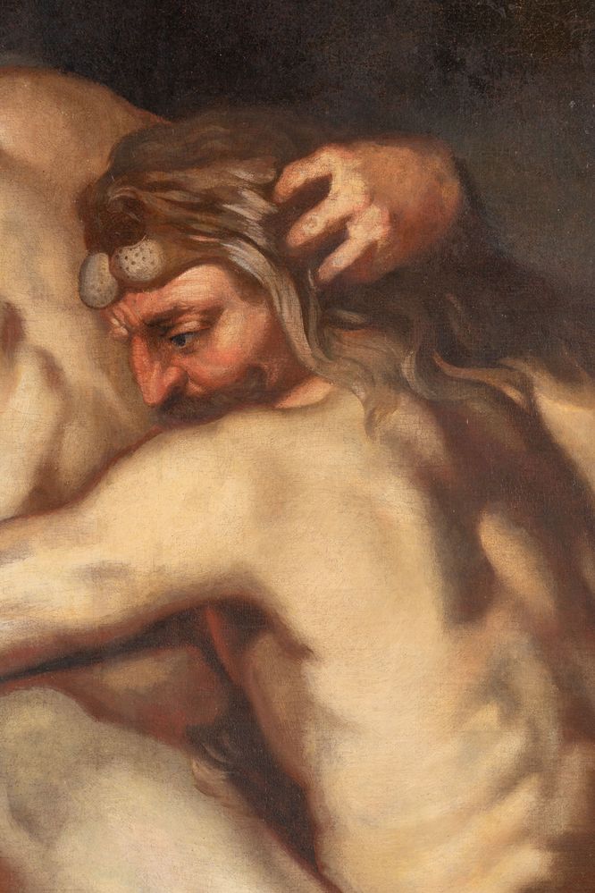Maestro nordico operante in Italia del XVII secolo. "Ercole e Anteo". Olio su tela. Cm 218,5x143,5. Reca tracce di sigla nel masso in basso al centro.