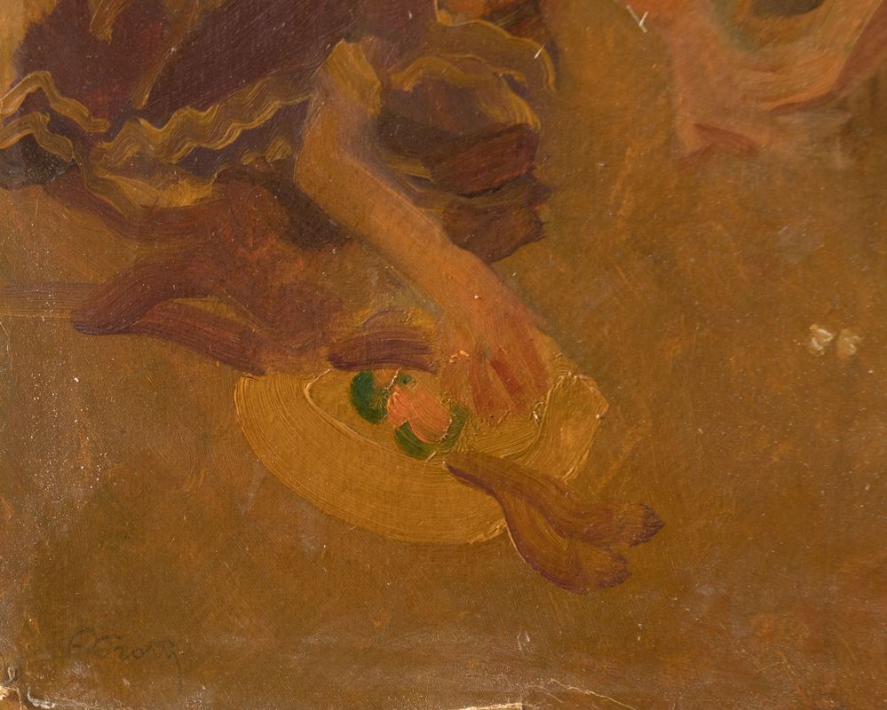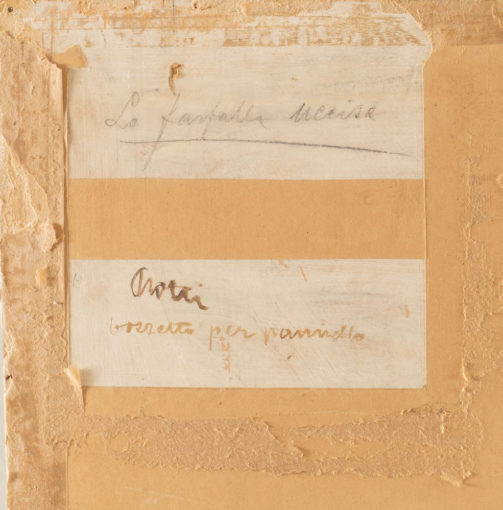 ALFREDO PROTTI (Bologna 1882 - 1949) "La farfalla uccisa". Olio su cartone. Cm 67,5x54,5. Al retro opera intitolata e firmata La farfalla uccisa, bozzetto per pannello, Protti.