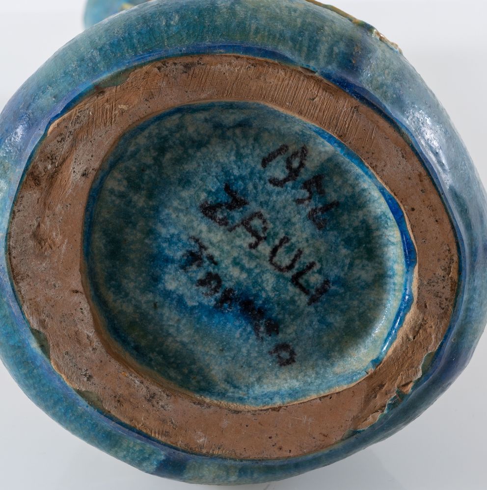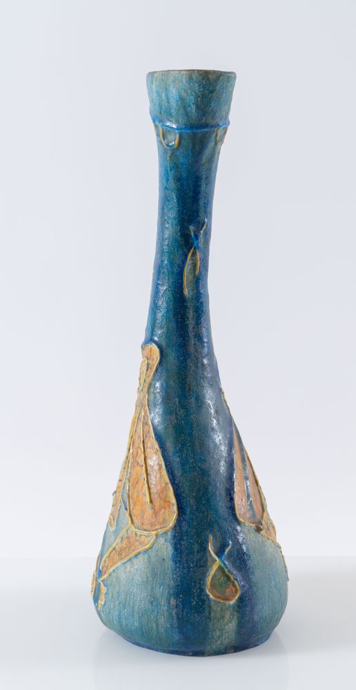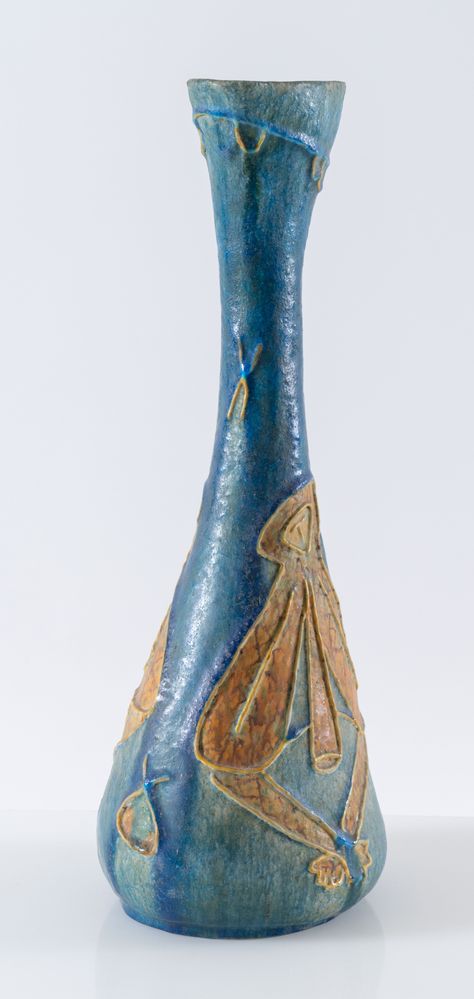 CARLO ZAULI (Faenza 1926 - 2002) Grande vaso in ceramica con rilievi figurati sui toni del blu, 1954. Cm 50,5x19x15. Alla base firmato e datato Zauli Faenza 1954.