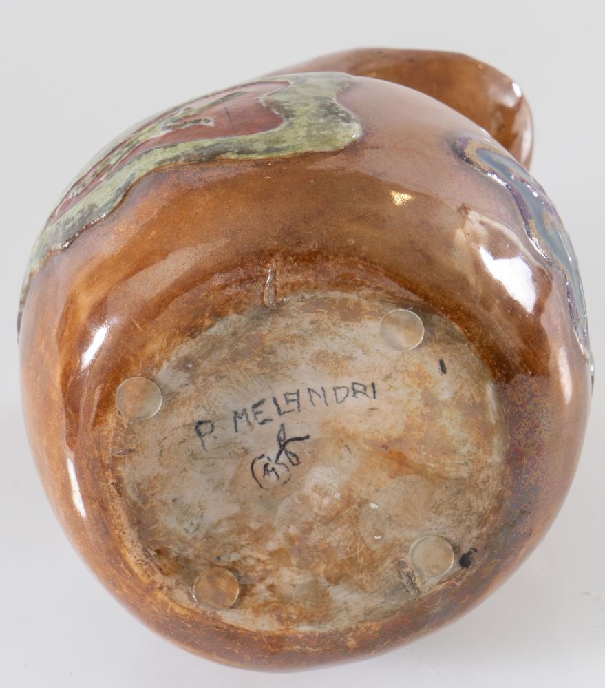 PIETRO MELANDRI (Faenza 1885 - 1976) "Senza titolo". Vaso scultura in maiolica policroma. Cm 17x12,5. Alla base firmato P. Melandri e M entro la mela.