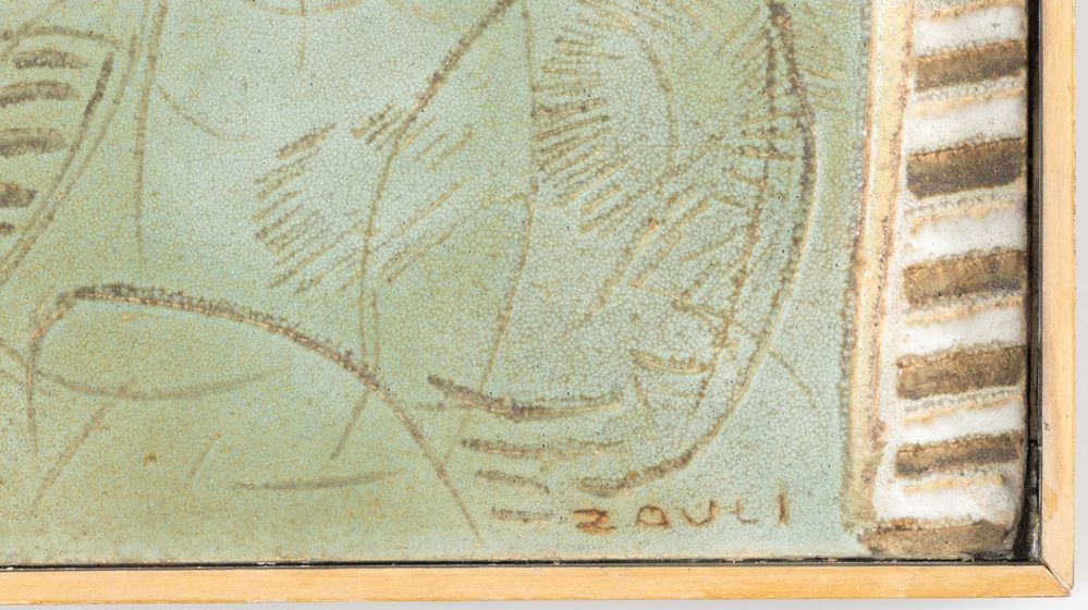 CARLO ZAULI (Faenza 1926 - 2002) "Senza titolo". Bassorilievo in ceramica policroma sui toni del grigio e del verde. Cm 30x55. Opera firmata in basso a destra Zauli. Al retro reca firma Zauli Faenza.