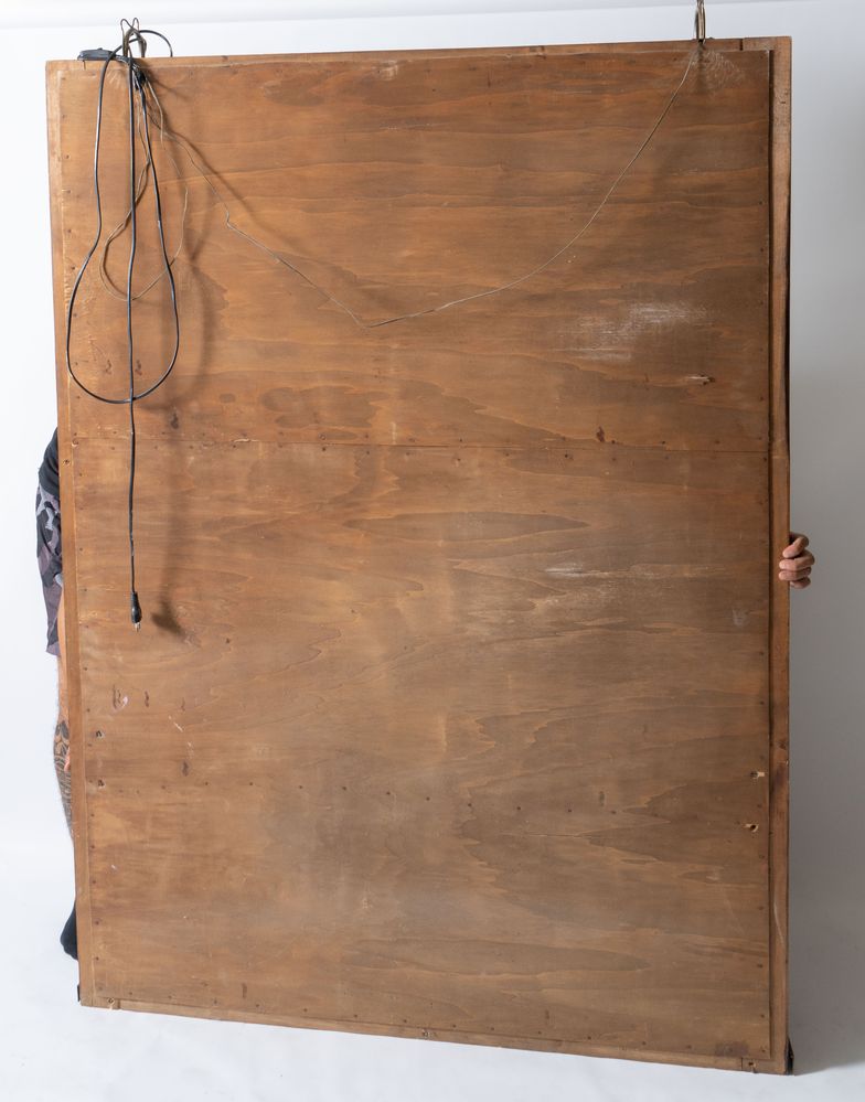 Specchiera con cassetti in legno e vetro con inserti in ottone. Prod. Italia, 1950 ca. Cm 182x126x37