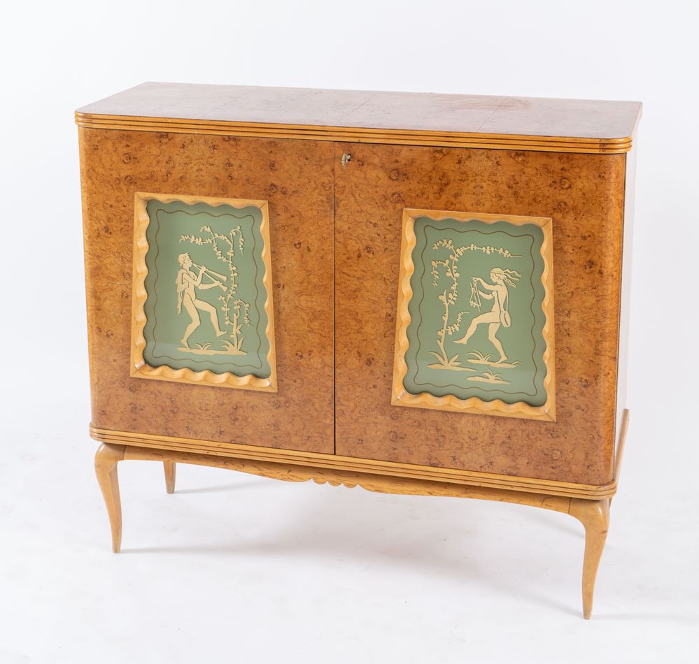 Mobile bar in legno e in vetro con l'interno specchiato e illuminato. Prod. Italia, 1950 ca. Cm 100x111x40