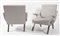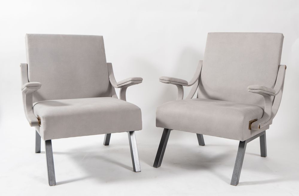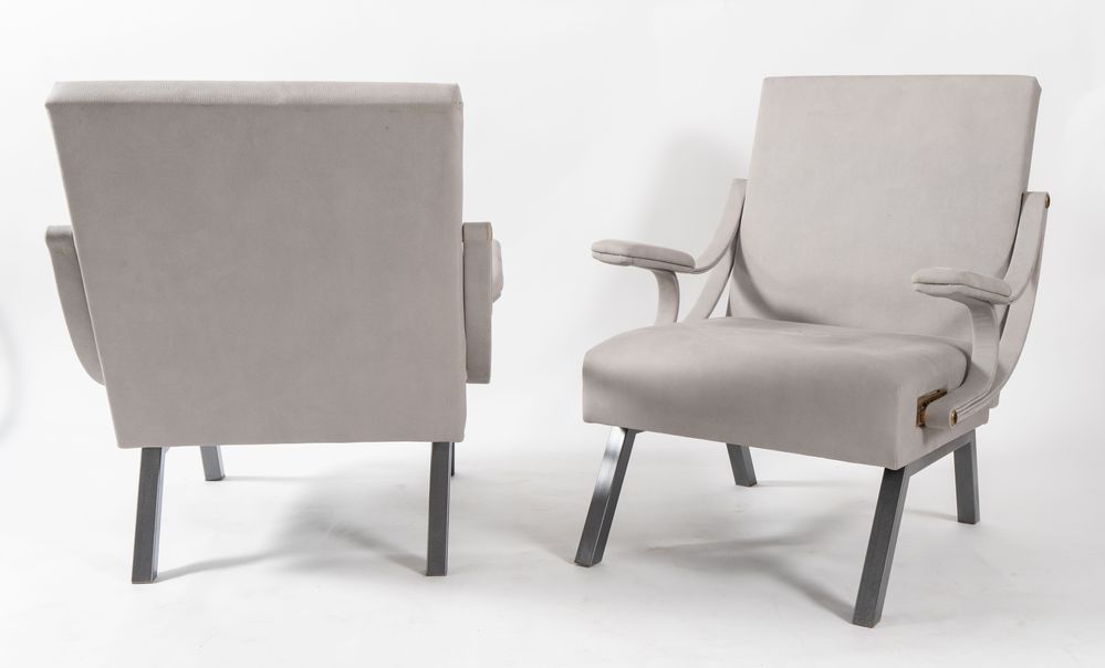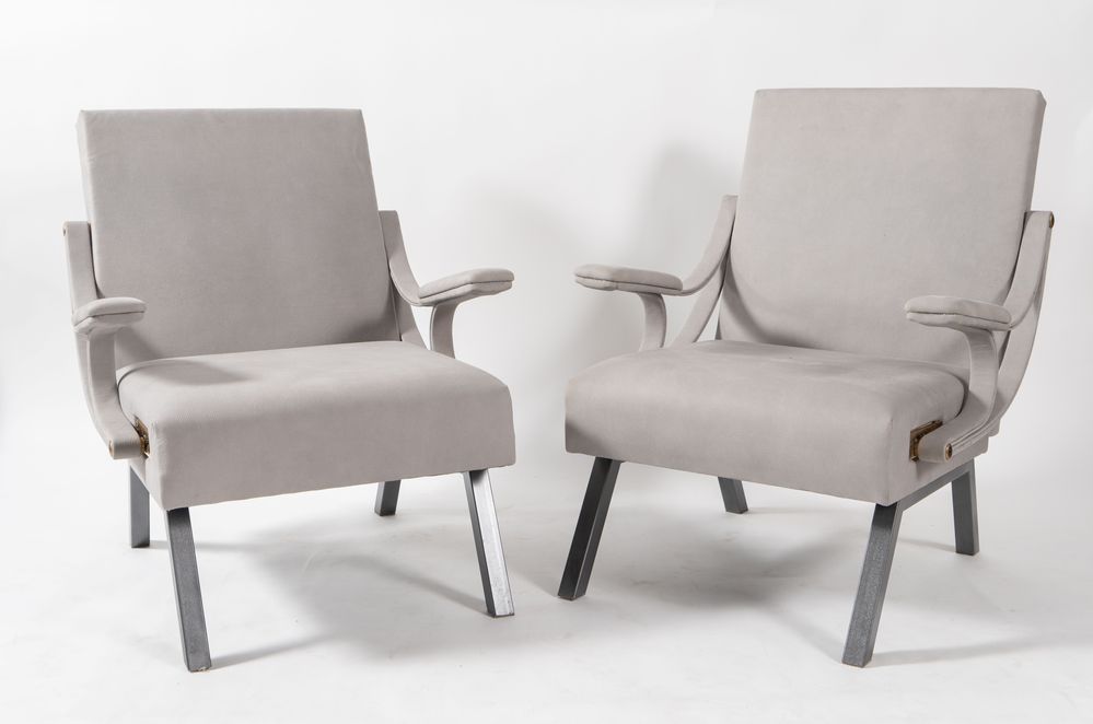 IGNAZIO GARDELLA Coppia di poltrone con struttura in metallo e rivestita in tessuto modello ‘Digamma’. Tessuto non originale, le gambe sono state sostituite e rifatte. Prod. Gavina, Italia, 1957 Cm 88,5x70x83