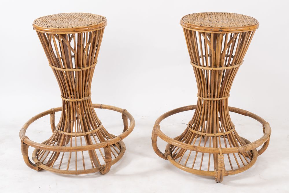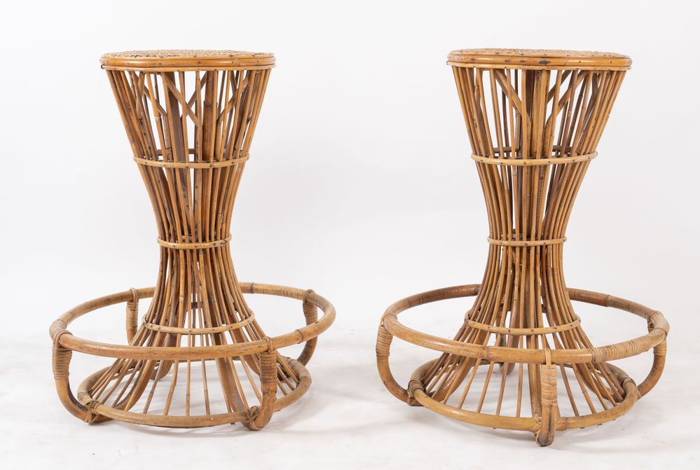 TITO AGNOLI Coppia di sgabelli in bambù e canna d’india. Prod. Bonacina, Italia, 1950 ca. Cm 72x60x60.