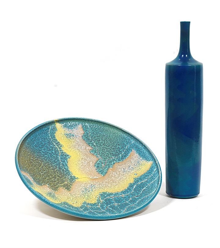 Piatto decorativo e bottiglia in terra rossa smaltata. Firma incisa Zauli sotto la base.