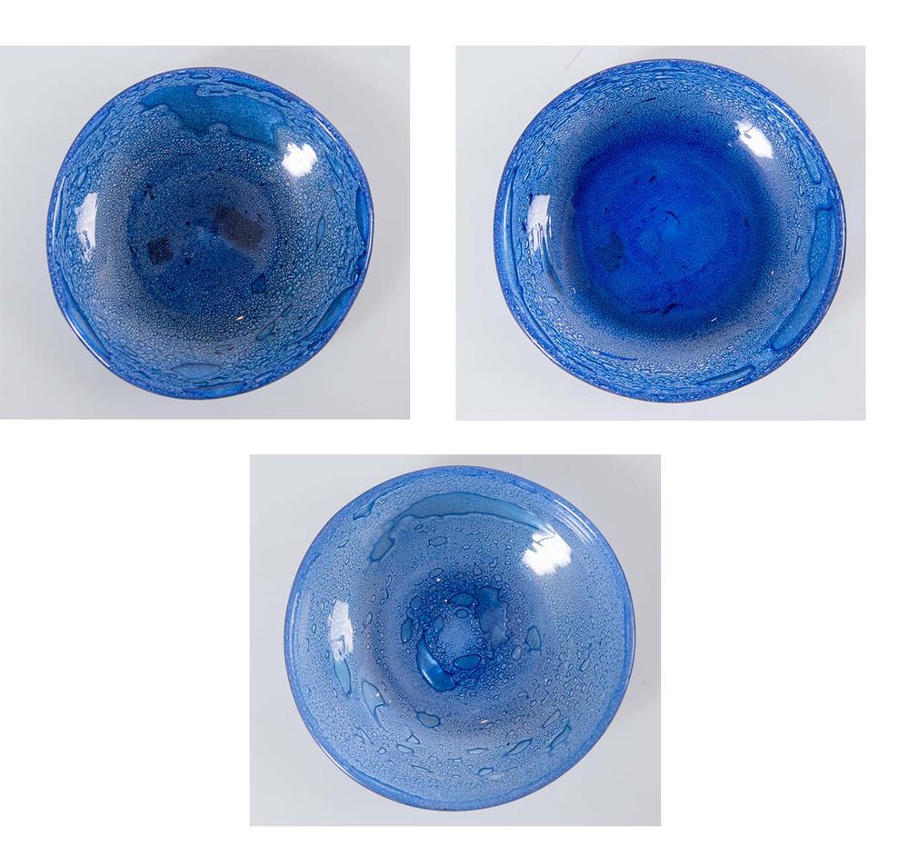 Tre ciotole in vetro soffiato. Firma alla base. Prod. Barovier & Toso, Murano, Italia, 1970 ca. Cm 3x16,5x16,5.