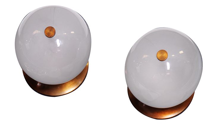 Coppia di lampade da parete o soffitto con struttura in metallo anodizzato e diffusori sferici sabbiati internamente.
