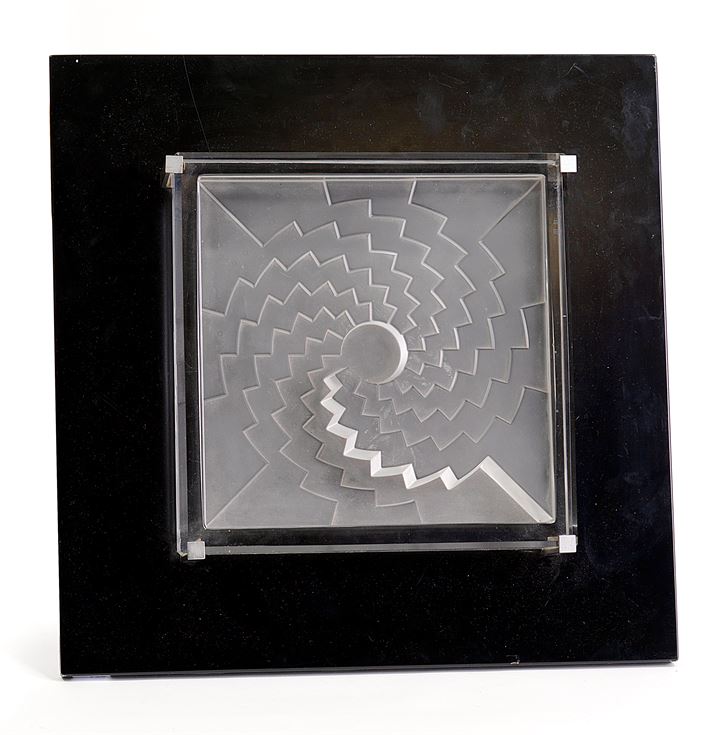 Multiplo in cristallo stampato e sabbiato su cornice in legno laccato nero con al retro placca in ceramica.