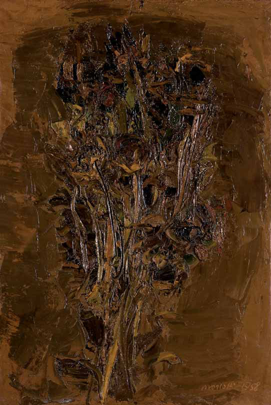 Ennio Morlotti Lecco 1910 – Milano 1992 Fiori (Mazzo di girasoli), 1958 olio su tela, cm 110x73,3. Firmato e datato in basso a destra: Morlotti 1958. Firmato e datato al verso: Morlotti 1958, Morlotti Imbersago. Provenienza: Milano, Galleria dell’Annunciata (etichetta al verso); Roma-Parigi, collezione Ponti. Esposizioni: Lecco, Azienda Autonoma Soggiorno e Turismo, Mostra antologica di Ennio Morlotti, 18 maggio- 16 giugno 1963 (etichetta al verso sul telaio); Roma, Palazzo Barberini, Ente Premi, Mostra antologica di Ennio Morlotti, 28 gennaio-15 marzo 1966 (etichetta al verso sul telaio); Darmstadt, Kunsthalle, Ennio Morlotti, 10 dicembre 1966- 19 gennaio 1967; Basilea, Kunsthalle, Ennio Morlotti, 28 gennaio-5 marzo 1967 (etichetta al verso sul telaio); Ferrarra, Civiche Gallerie d’Arte Moderna e Contemporanea, Palazzo dei Diamanti, Morlotti opere: 1940-1992, 6 marzo-12 giugno 1994 (etichetta al verso); Conegliano, Galleria Comunale d’Arte, Palazzo Sarcinelli, Morlotti. Opere 1936-1991, 10 novembre 1996-6 gennaio 1997; Parma, Galleria Niccoli, L’Informale Italiano. Pittura di segno e di materia negli anni Cinquanta, 15 dicembre 1997-2 marzo 1998. Bibliografia: G. Ballo, La linea dell’arte italiana. Dal Simbolismo alle opere moltiplicate, Roma 1964, vol. II, tav. 208 riprodotto; Mostra antologica di Ennio Morlotti, catalogo della mostra, Palazzo Barberini, Roma 1966, tav. 35 riprodotto; R. Carrieri, Nuovo brogliaccio. I silenzi di Ennio Morlotti, in “Epoca”, 6 marzo 1966, a. XVIII, n. 839, p. 96 riprodotto; Ennio Morlotti, catalogo della mostra, Kunsthalle, Darmstadt 1967, tav. 22 riprodotto; Ennio Morlotti, catalogo della mostra, Kunsthalle, Basilea 1967, n. 35; A. C. Quintavalle, Morlotti struttura e storia, Milano 1982, tav. 67 riprodotto; Morlotti opere: 1940-1992, catalogo della mostra, Civiche Gallerie d’Arte Moderna e Contemporanea, Palazzo dei Diamanti, Ferrarra 1994, tav. 30, p. 97 riprodotto; Morlotti. Opere 1936-1991, catalogo della mostra, Galleria Comunale d’Arte, Palazzo Sarcinelli, Conegliano 1997, p. 133 riprodotto; L’Informale Italiano. Pittura di segno e di materia negli anni Cinquanta, catalogo della mostra, Galleria Niccoli, Parma 1998, p. 100 riprodotto; G. Bruno, P. G. Castagnoli, D. Biasin, Ennio Morlotti. Catalogo ragionato dei dipinti, Milano 2000, vol. I, n. 484, p. 224 riprodotto.