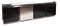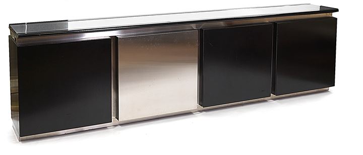 Fronte a tre sportelli in legno laccato ed un cassettone bar rivestito in acciaio.