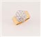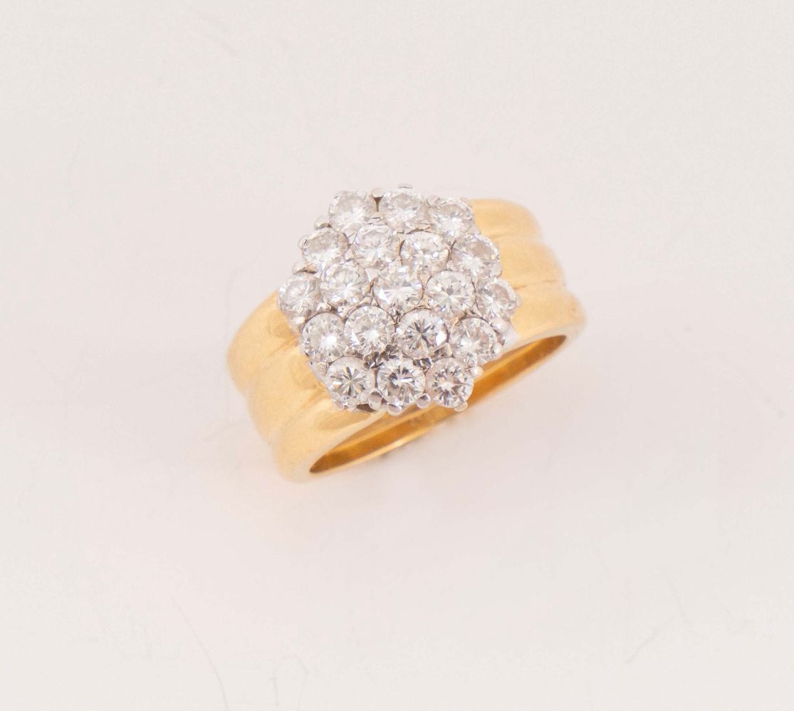 Anello in oro giallo e bianco 18k sormontato da pavè di diamanti di forma esagonale. Peso complessivo: 10,70 gr.