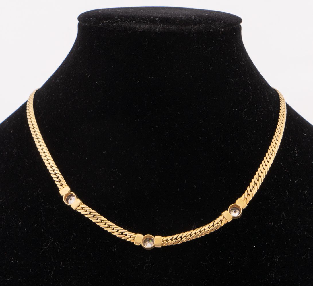 Collier in oro giallo 18k realizzato a maglia larga e decorato da tre zirconi. Peso complessivo 17,50 gr.
