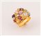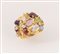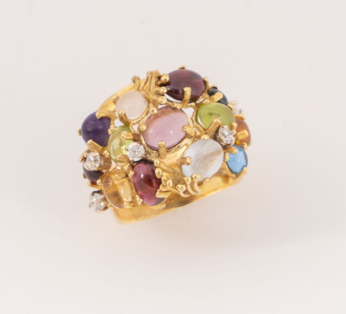 Anello in oro giallo 18k realizzato a fascia larga sormontato da cinque brillanti e pietre dure di diverso colore. Peso complessivo: 13,5 gr.