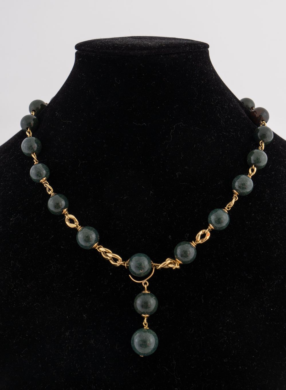 Coppia di collane in oro giallo 18k con boule di pietre verdi. Peso complessivo: 110 gr.