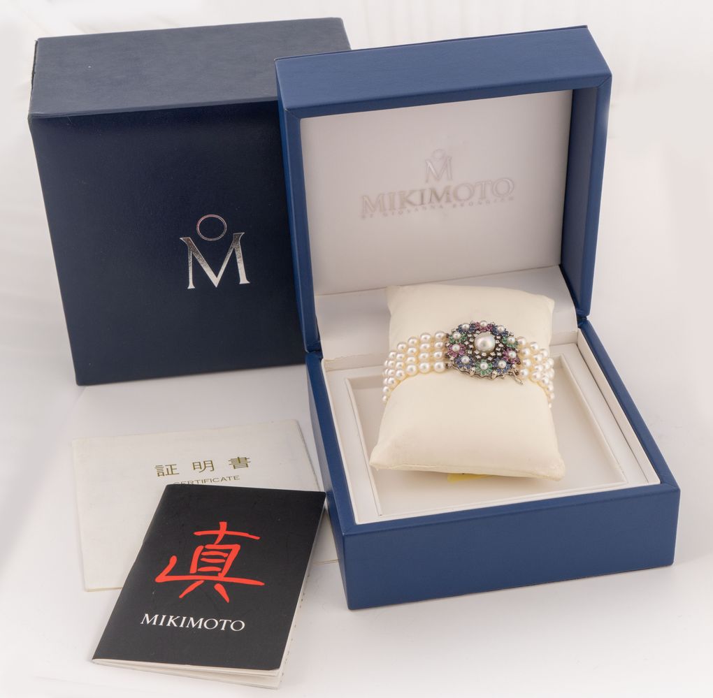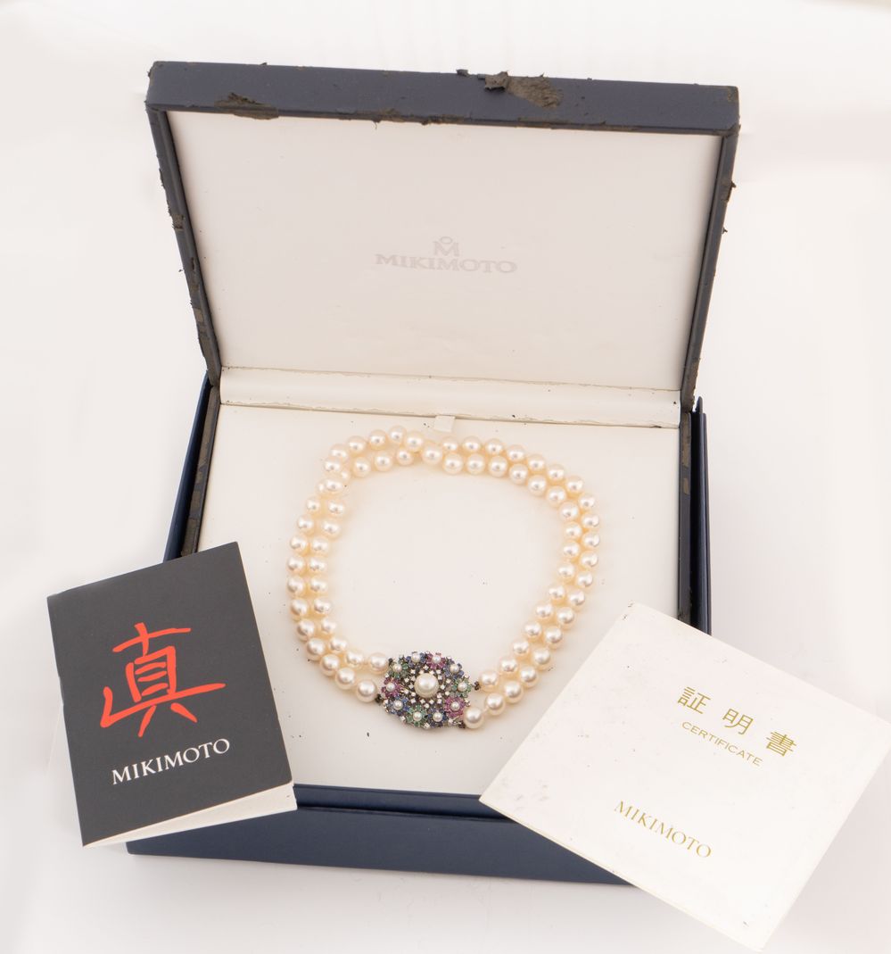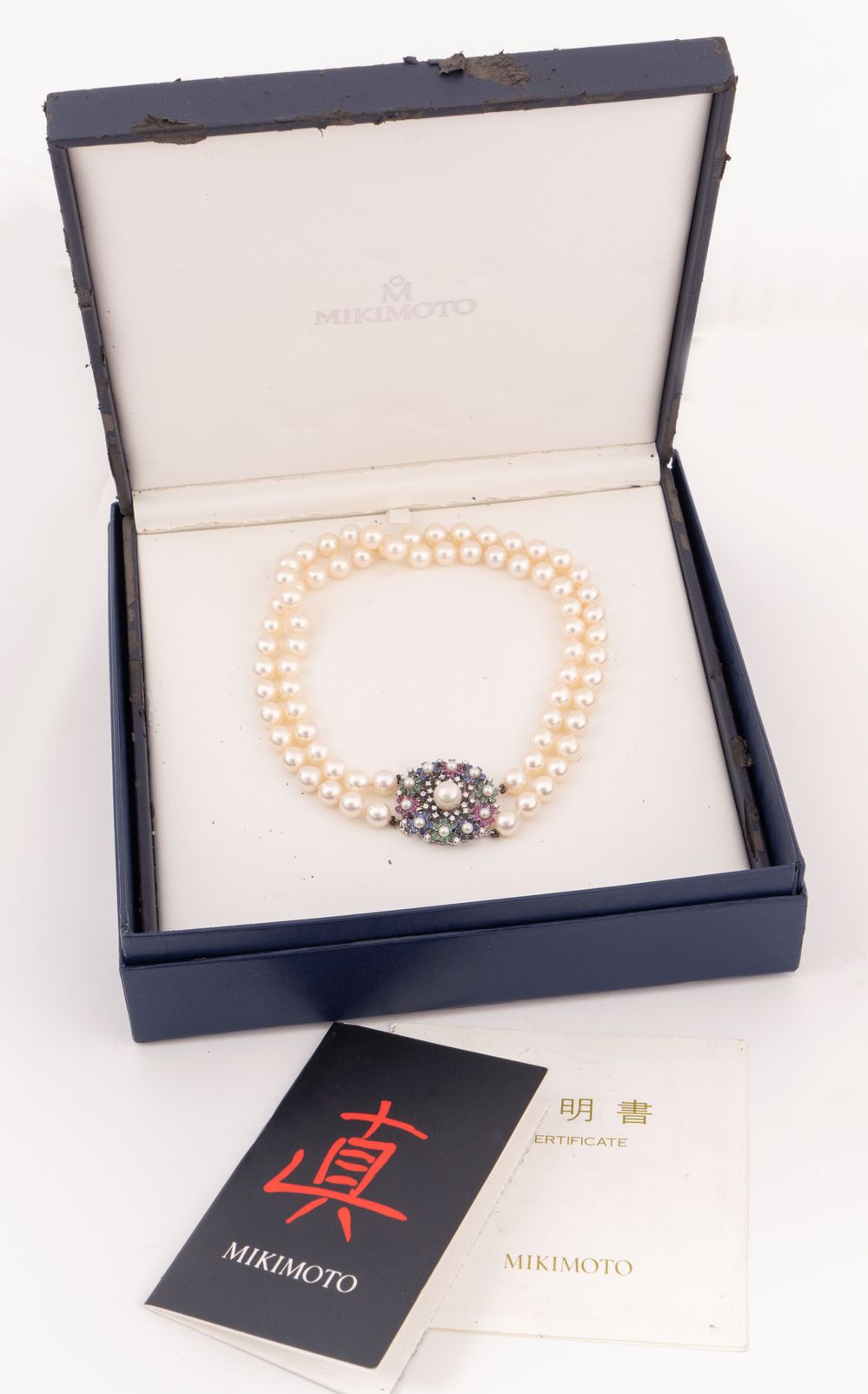 MIKIMOTO Parure composta da bracciale e collier realizzati a più fili di perle Akoya con chiusure in oro bianco arricchite da diamanti, rubini, smeraldi, zaffiri. Ciascun elemento è corredato di scatola originale e accompagnato da certificato Mikimoto.