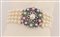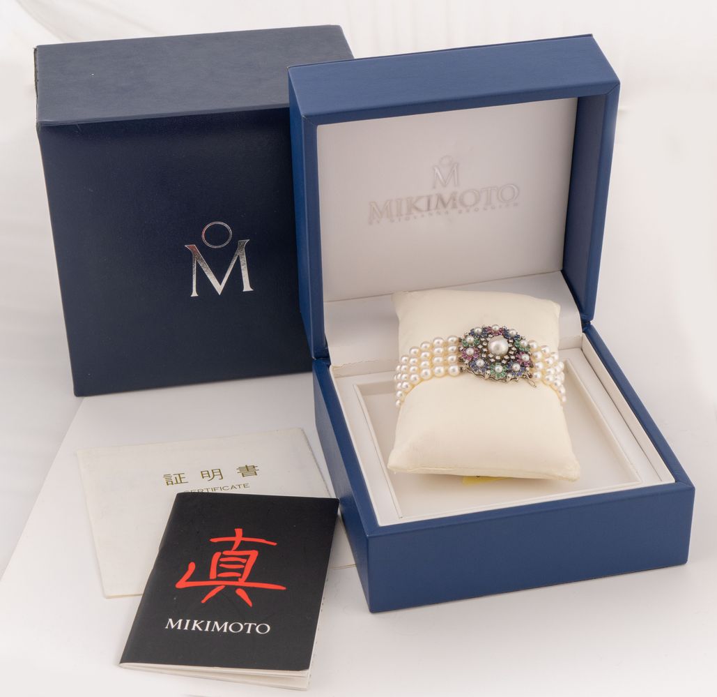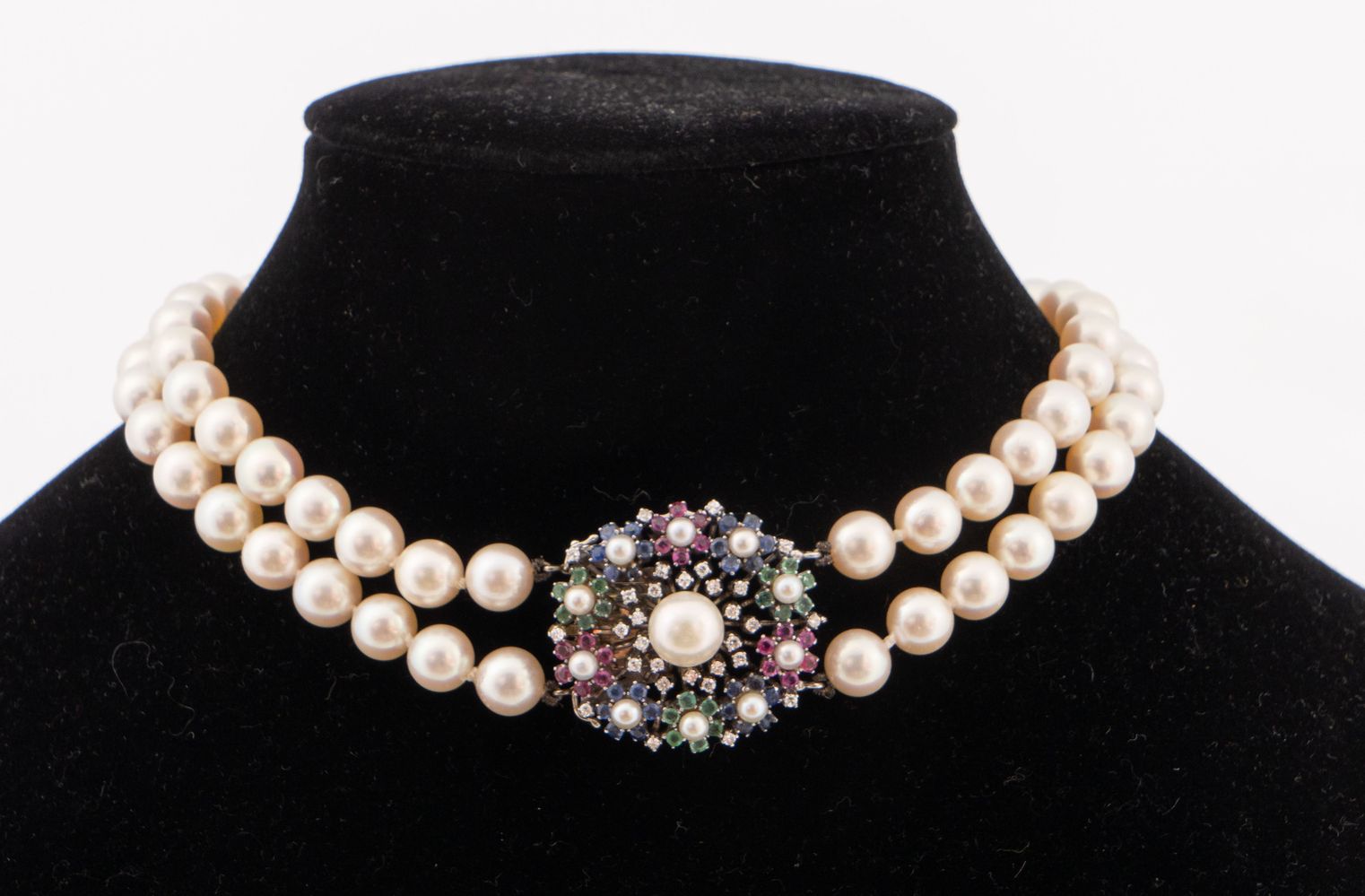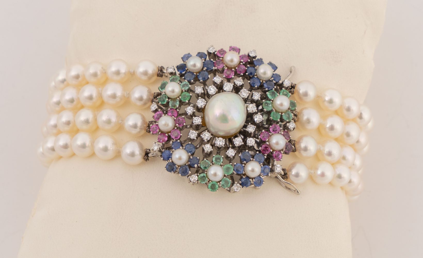 MIKIMOTO Parure composta da bracciale e collier realizzati a più fili di perle Akoya con chiusure in oro bianco arricchite da diamanti, rubini, smeraldi, zaffiri. Ciascun elemento è corredato di scatola originale e accompagnato da certificato Mikimoto.