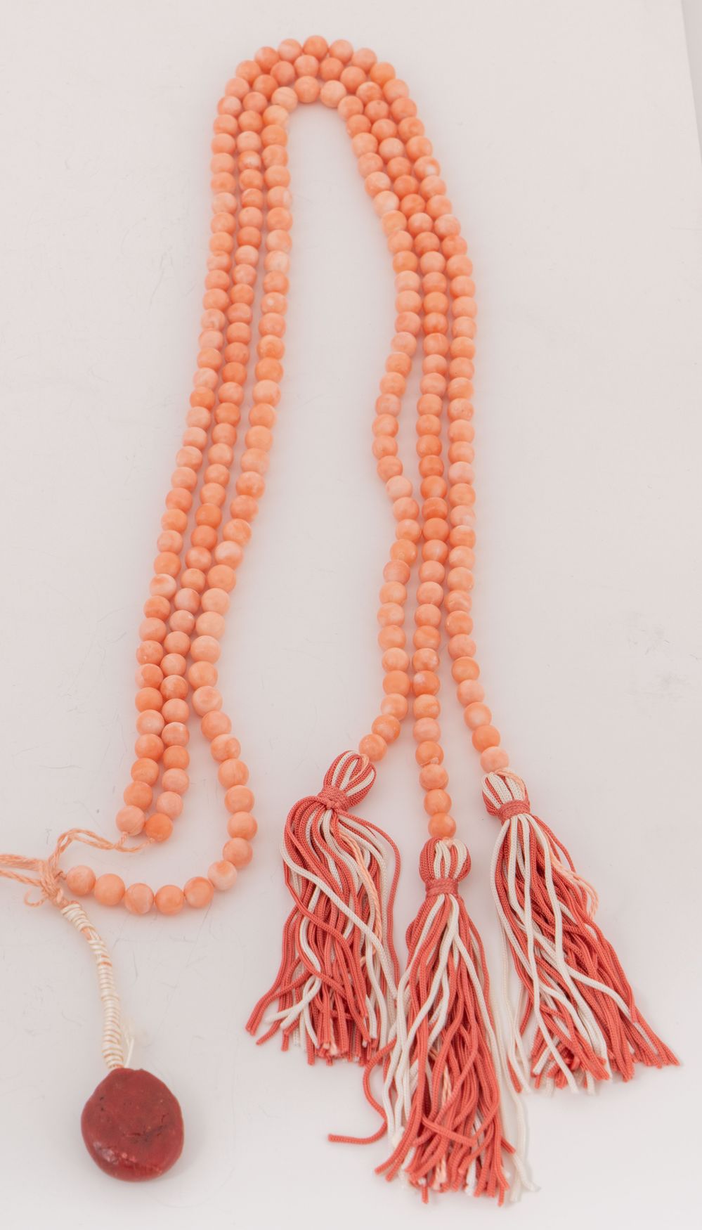 Tre fili di corallo rosa, diametro 7-7 1/2, con ceralacca e nappe. Gr 100.
