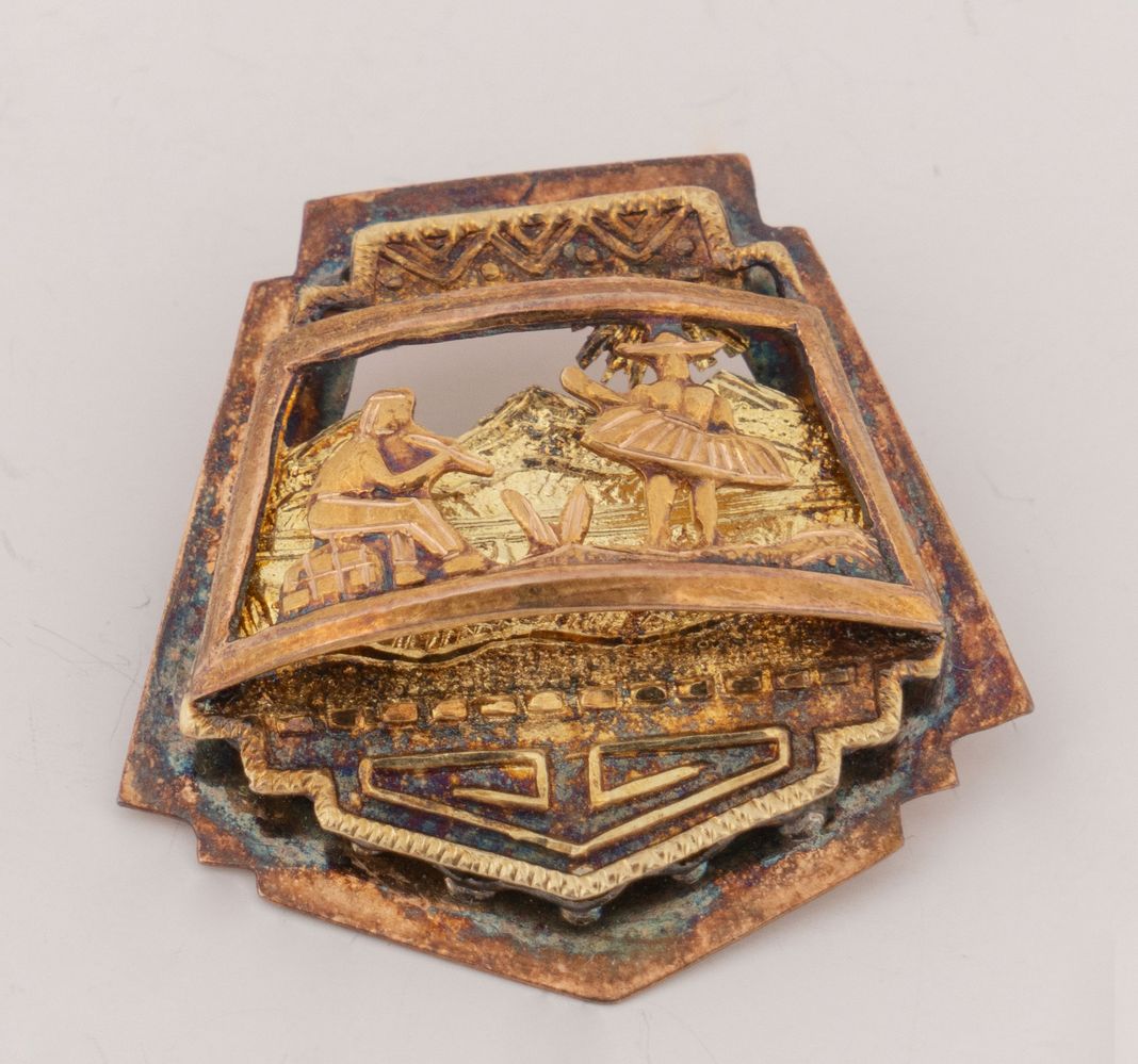Spilla in oro giallo misto 18k e a basso titolo. Peso complessivo: 9 gr.