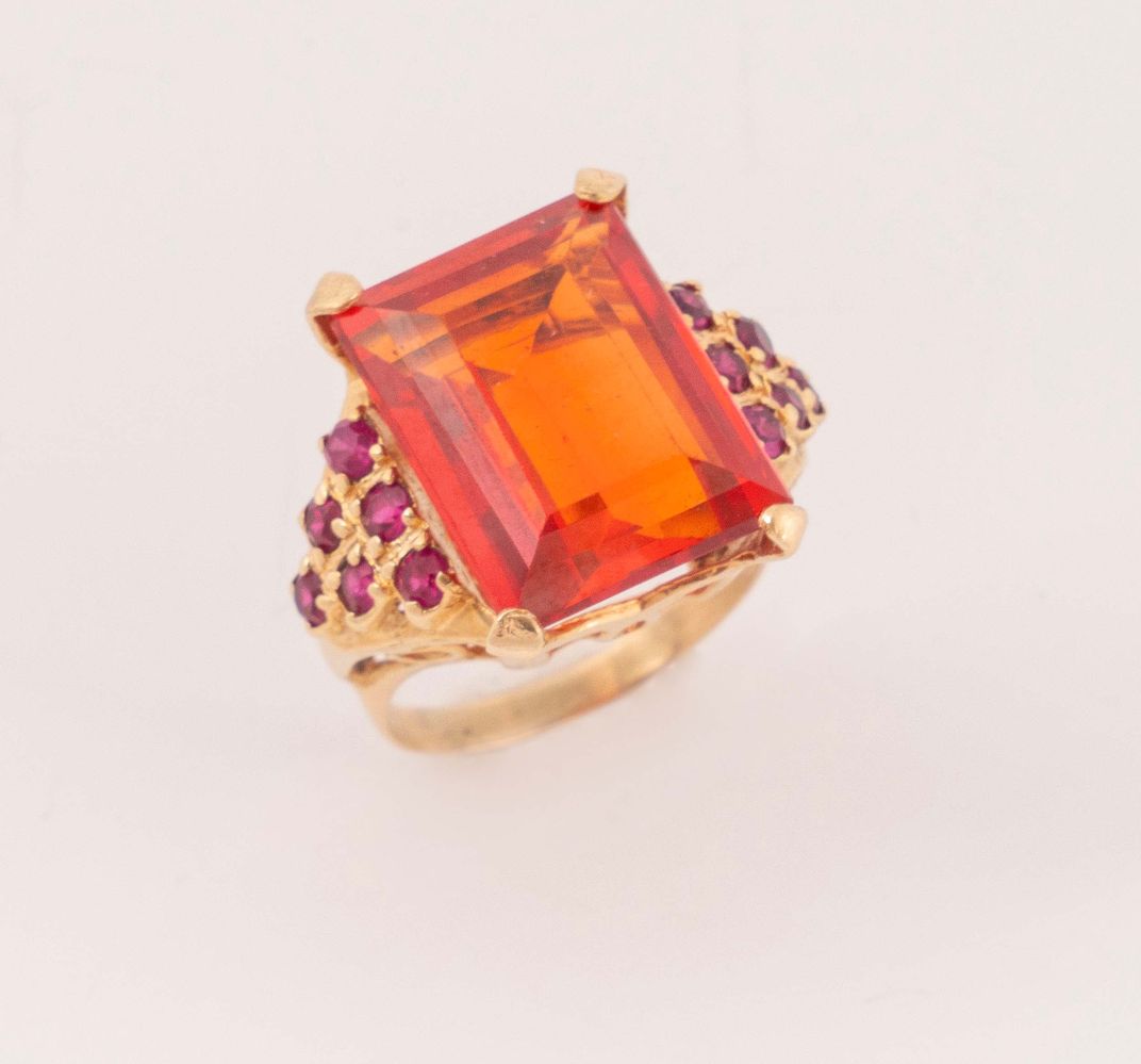 Anello in oro giallo 18k centrato da grande pietra sintetica rossa. Peso complessivo: 11,20 gr.