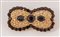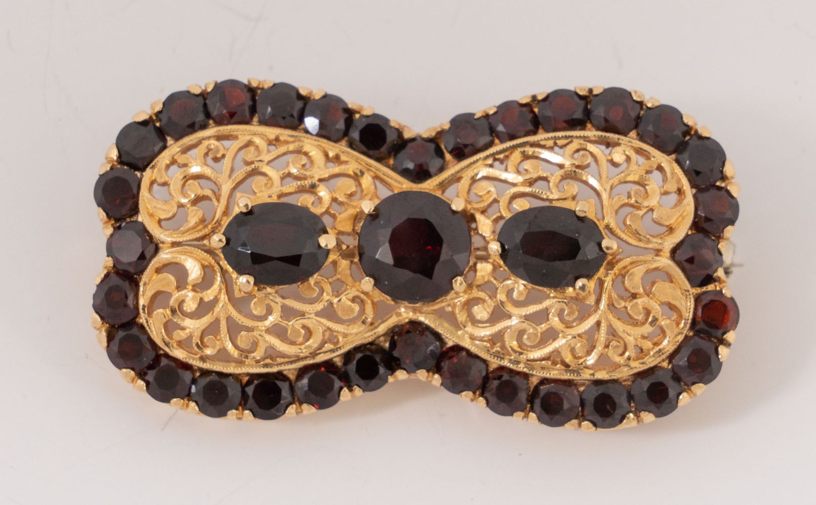 Spilla in oro giallo 18k realizzata a fiocco decorato da granati. Peso complessivo: 16,80 gr.