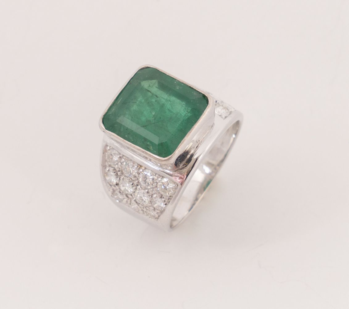 Anello in oro bianco 18k con smeraldo rettangolare e brillanti. Peso complessivo: 9,20 gr.