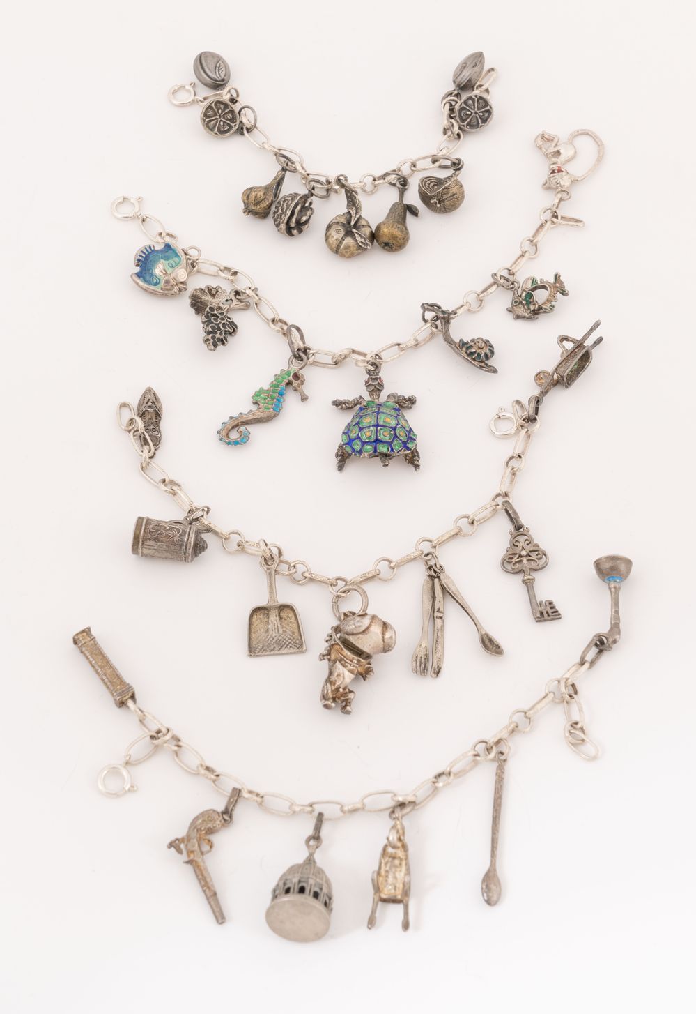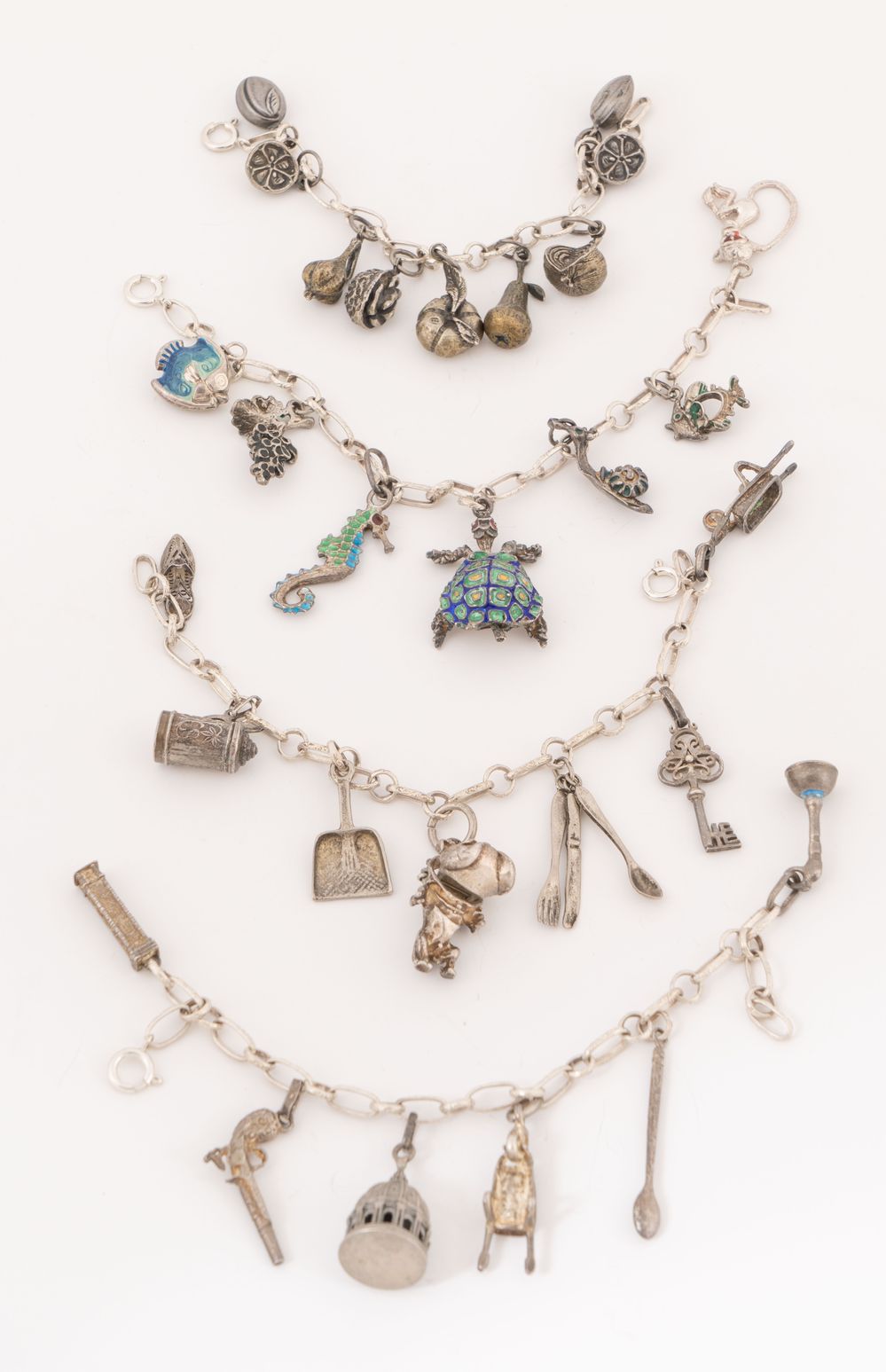 Lotto 75 | Lotto composta da quattro bracciali in argento con charmes. Peso complessivo:...