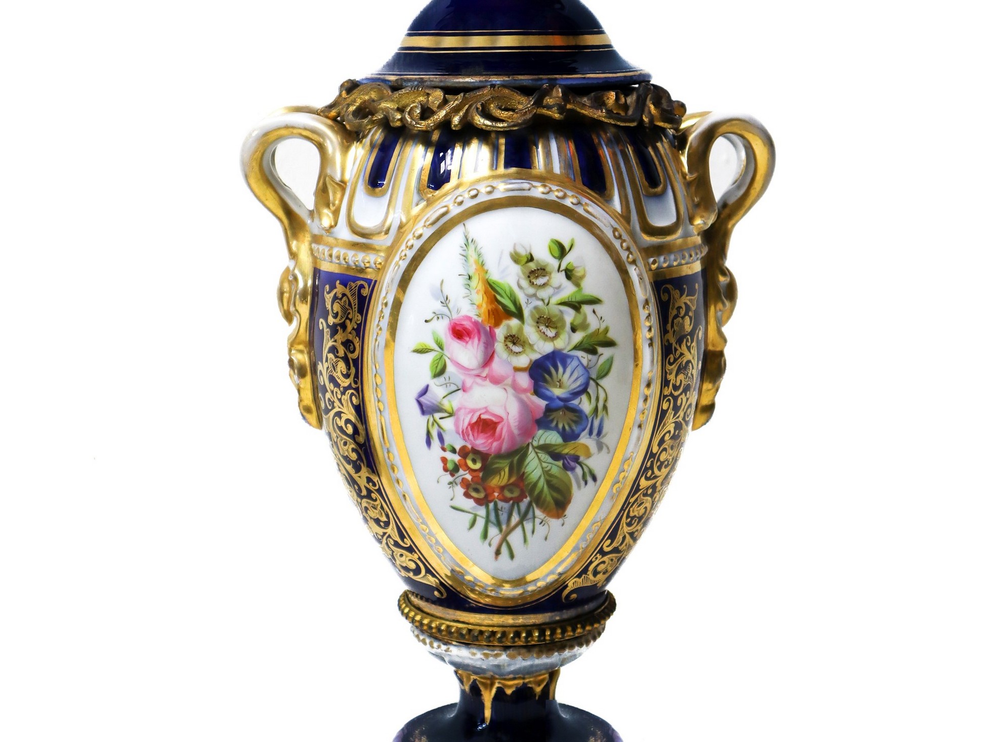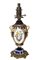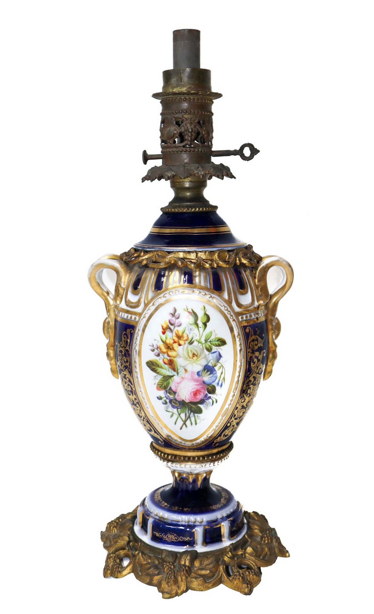 Coppia di lumi a petrolio in porcellana e bronzo, Fine XIX Secolo h cm 80 Dipinti su fronte e su retro con motivi floreali e particolari dorati su fondo blu.
