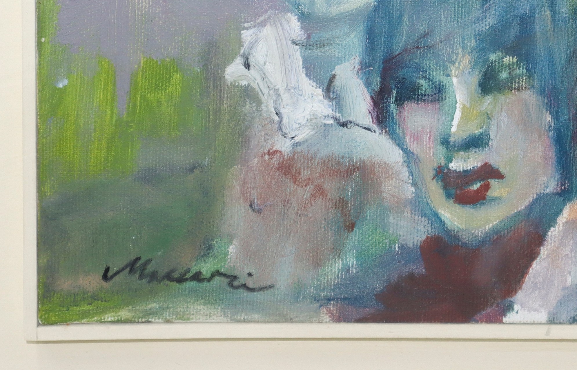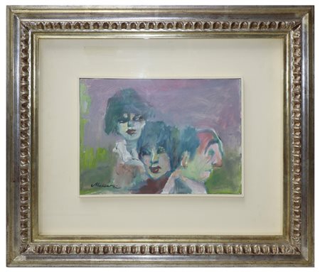Mino Maccari (Siena 1898-Roma 1989) - Tre personaggi, 70's cm 25 x cm 35; in cornice cm 57 cm x cm 67 Dipinto a olio su tela Firmata in baso a sinistra e sul retro. Archivio Generale del Maestro Mino Maccari a cura di Marco e Francoise Maccari al N. 48/96 del l'8 /6/2022.