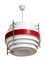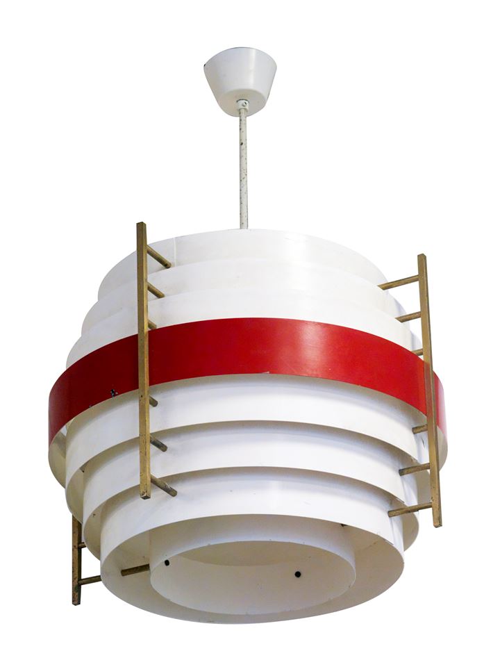 Lampadario con paralume costituito da fasce in alluminio laccato distanziate da intelaiatura in ottone.