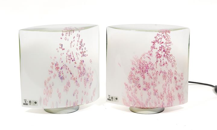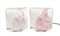 Coppia di lampade da tavolo con base in alluminio bianco sfumato cristallo con perle in vetro rosa su un lato.